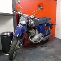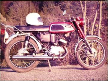 Da mich meine schöne Yamaha reute, bei Schnee und Eis zu fahren, kaufte ich im Herbst 1973 einem SBB-Kondukteur für 400 Franken seine «alte» 125er-Honda ab: Diese Maschine war während Jahren bei Göpf Keller selig (heute: Honda-Keller) in Bauma im Schaufenster gestanden und ihr Besitzer kaufte sie günstig und fuhr nur wenige Kilometer. Diese 1964er-Honda hatte bereits einen Elektrostarter, aber keine Blinker und ein Licht, dessen Ausbeute etwas mehr als einem Velolicht (von damals) entsprach! Der Strom für beides kam aus einer kitzekleinen Batterie, die im Seitenkasten befestigt war. Als Ruine, von den Winterfahrten auf salzigen Strassen, habe ich sie 1976 an einen meiner Realschüler verschenkt, der sie restauriert und zu neuem Leben erweckt hat. |