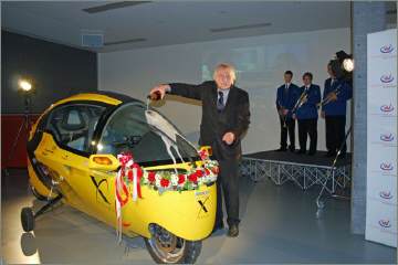 Winterthur, 15. November 2010 - Am Montag, 15. November, empfing die Stadt Winterthur feierlich das aus Winterthur stammende Gewinnerteam des prestigeträchtigen US-Elektrofahrzeug-Wettbewerbes «Progressive Insurance Automotive X-Prize» im Technopark Winterthur. Das Team setzt sich aus Mitarbeitenden der Winterthurer Firma Peraves AG zusammen, welche die beiden erfolgreichen E-Tracer-Fahrzeuge entwickelt und gebaut hat. Im Anschluss an die Begrüssung wurde eines der beiden Fahrzeuge auf den Namen «Spirit of Winterthur» getauft. |