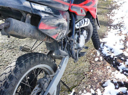 Offroad-/ MotoCross-Reifen gehören ins Gelände: Solche Reifen haben auf festem Untergrund wenig Halt, da der Positivanteil (direkter Kontakt Gummi-Strasse) sehr gering ist! Besonders gefährlich beim Fahren zu zweit und in der Nässe! |