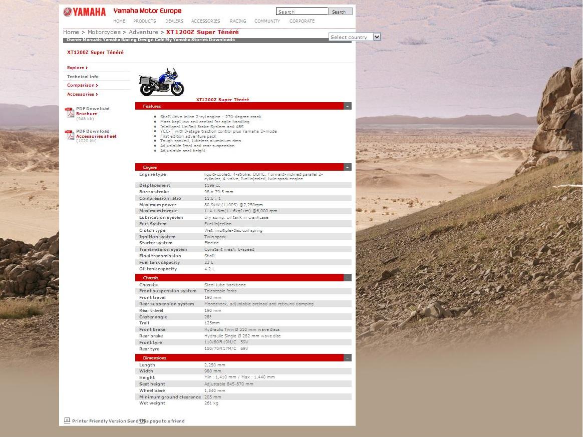 Die Yamaha zielt ins Segment der Strassenenduromaschinen, diejenige von Honda in die Sporttourermaschinen. In beiden Segmenten war BMW sehr aktiv, was jeweils im Markt Reaktionen auslöst. So hat beispielsweise Aprilia mit seiner neuen Multistrada der BMW R1200 GS den Kampf angesagt, indem sie die Maschine mit Elektronik vollgestopft haben und das Konzept rein für die Strasse (im Unterschied zur GS) ausgerichtet haben. Yamaha hat die XT1200 ebenfalls mit 2 Fahrmodi ausgestattet, die es erlauben, die Maschine lieber gediegen tourig oder eben eher sportlich zu fahren. Dabei zeichnet sich die Yamaha mit einer immer sehr gutmütigen Art aus, ihren Fahrer dank der langen Federwege möglichst komfortabel selbst über die grössten Rumpelpisten zu tragen. Der Zweizylinder-Twin-Motor verrichtet dabei eine effiziente, aber unspektakuläre Arbeit, die zum leichten Fahrverhalten passt: Würde nicht «1200» auf der Verkleidung stehen, man würde aufgrund der Leichtigkeit und Wendigkeit, aber auch aufgrund des kaum spürbaren Gewichtes sich nie auf einer «grossen» Maschine fühlen. Die Ausrüstung ist in dieser Klasse Standard: Ein kaum wahrzunehmendes ABS-Bremssystem unterstützt die ansonsten konventionell gehaltenen Bremsen in Notsituationen – dies ohne Aufpreis! Das Motorrad ist, wie für Japaner üblich zweckmässig und ohne überflüssigen Firlefanz in bester Qualitität bis ins letzte Detail sauber verarbeitet. Es weckt beim Fahrer wenig Emotionen, im Gegensatz zu einem bärenstark antretenden Triumph Tiger – dafür wird sich der Eigner auch nach vielen Jahren auf diesen zuverlässigen Kumpel verlassen können. Inwieweit die Super Ténéré Wüsten-Qualitäten aufweist, wie sie aufgrund des Namens und des Looks verspricht, kann ich nicht beurteilen. |
