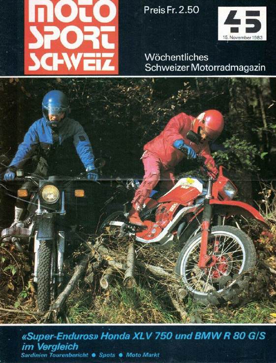 1984 gab es im MotoSportSchweiz, dem Schweizer Töff-Heftli, einen Vergleichstest der beiden zweizylindrigen «Super-Enduros», der Honda XLV 750 und der BMW R80 G/S, welche seit ihrer Einführung 1981 keine grossen Änderungen erfuhr. Ich habe Teile aus dieser MSS-Nr. 45 vom 15.November (richtig, das Heftli erschien wöchentlich und deckte wie im Namen bezeichnet auch den damals gut vertretenen Sport ab, vom Moto-Cross, über Marken-Cups bis hin zur Schweizer Strassenmeisterschaft mit den jeweiligen Resultaten!) eingescannt, die Du Dir hier als PDF [4'597 KB]