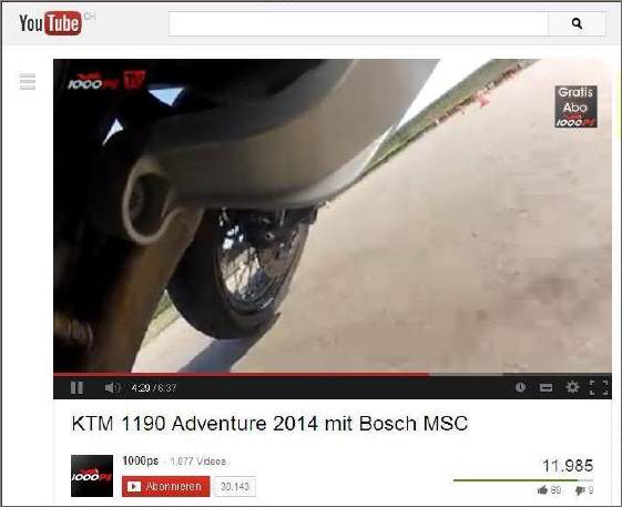 Die KTM 1190 Adventure ab Jahrgang 2014 wird serienmässig mit dieser neusten ABS-Stufe ausgerüstet und alle Fahrer einer Adventure mit Jahrgang 2013 können dieses Software-Paket nachträglich erwerben: Ihre Maschinen haben alle die Ausrüstung bereits an Bord, nur wurde sie noch nicht MSC (motorcycle stabilisation control)-mässig genützt. Auch anderen Anbietern wird dieses von KTM mit der japanischen Niederlassung von Bosch in Japan entwickelte System für die Zukunft zur Verfügung stehen. KTM hat sich jahrelang gegen ABS-Systeme gewehrt, musste aber aufgrund der Bedeutung des deutschen Markts sich der Marksituation beugen: Sie gaben sich aber nicht damit zufrieden, sondern gingen einen Schritt weiter, die bis anhin kurven-untauglichen ABS-Systeme beim Kurvenbremsen weiterzuentwickeln und wurden nun fündig: Damit gibt es keine Argumente mehr gegen die ABS-Systeme, zumindest nicht jene, die nun bei ausgewählten Modellen in der höchsten Preisklasse eingesetzt werden. |