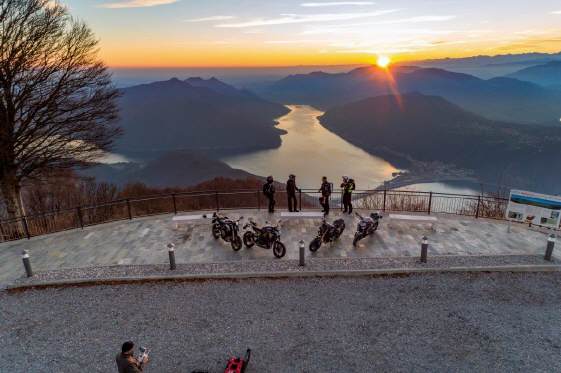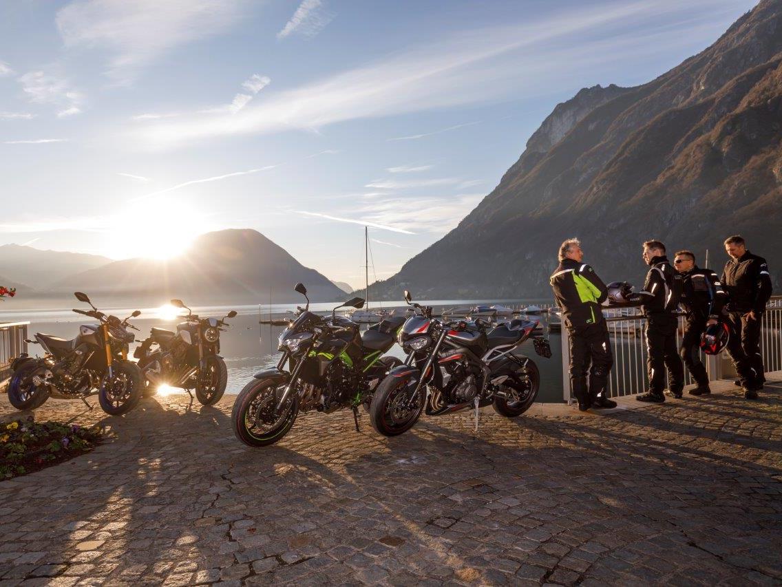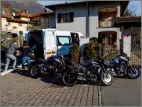 Dort trafen wir auf Micha Kutschke, den zweiten Redaktor und Roger, der vierte Fahrer im Bunde. Von der Grenze bei Lugano waren es nur etwa 25 Kilometer ins Hotel, von wo wir jeweils starteten. Kaum angekommen, traf auch der Fotograf Jörg ein und es ging ans auspacken bzw. abladen der Motorräder: Die neue Kawasaki Z900, die neue Triumph Street Tripple 765 und die bekannten Modelle Honda CB650 Neo Sports-Café sowie die Yamaha MT-09. |