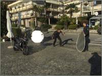Es galt die guten Lichtverhältnisse zu nützen und so fuhren wir an Hafenpromenade von Porlezza, das kleine gepflasterte Plätzchen bei der Bar Modulus 2000 an der Via Lungo Lago Giacomo Matteotti, 26. Dort installierten wir uns für die Detailbilder der Maschinen und, als die Sonne langsam unterging, für ein paar stimmige Bilder der Maschinen und der Test-Crew. |