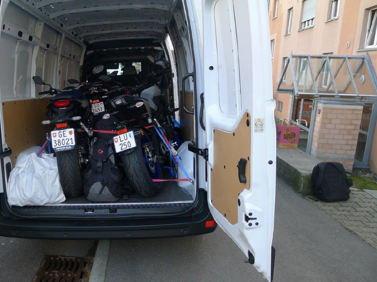 Schliesslich wurde aufgrund der Wetterbedingungen am Donnerstag, 9.Januar (ein Tag nach meinem Winterfahrkurs mit dem eigenen Auto auf Schnee und Eis in Zernez) gestartet: Dimitri holte mich mit dem Renault Master-Bus, in welchen alle vier Maschinen passte, am frühen Vormittag ab und wir fuhren über den Gotthard-Tunnel ins Tessin. |
