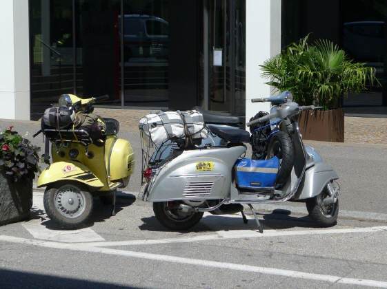 Anlässlich unserer Ferien in Ascona sahen wir vier «coole Typen» mit ihren Oldtimer-Vespas im Café sitzen. Auf diesen Gefährten über die Pässe zu fahren (mit Walliser Kennzeichen) ist ein Härtetest für das Rückgrad: Die kleinen Räder fallen in jedes Loch, in jede Unebenheit - und dies bei vollbeladenem Fahrzeug mit Feriengepäck, das bereits einen grossen Teil der Federung aufbraucht ... Die Generation ihrer Grosseltern fuhren auch solche Distanzen, weil die Vespa das einzige Gefährt war, das sie sich leisten konnten. Die Cafés aber damals in Ascona sahen wahrscheinlich noch etwas anders aus!