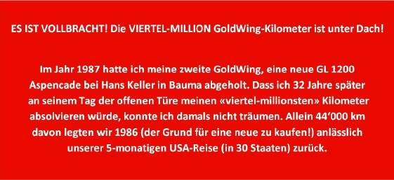 Am 6.Februar 1985 holte ich bei Hans Keller, Honda-Keller in Bauma, meine GL1200 Aspencade ab, die ich am 24.Dez. 1984 bar bezahlt hatte. Auf dem Bild ist Luzia bei ihren Versuchen, die «grosse» GoldWing auf den Hauptständer zu stellen. Mit Luzia, meiner späteren Ehefrau, reiste ich 1986 vom 20.Mai bis zum 26.Oktober durch die USA, legte in insgesamt 30 Staaten sowie in Ost- und West-Kanada insgesamt 44'000 Kilometer zurück. Heute hat diese GoldWing einen Stand von 250'000 km (Stand: April 2017)