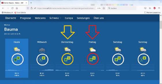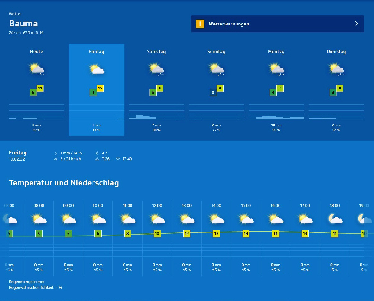 Anlässlich der Einladung von Honda (Schweiz) zur Test-Week kontaktierte ich Ivan Eberle von Honda-Keller, ob er nur eine Maschine habe zum Anschauen oder auch zum Fahren. Als er die Probefahrtsmöglichkeit bejahte, schaute ich sofort im Wetterbericht nach, wann die beste Gelegenheit in der Woche 7 wäre: Und, welch ein Glück, in der Temperaturkurve ging es am Freitag steil nach oben mit Tagestemperaturen zwischen 15 (Mittelland) und 18 Grad (Basel/Wallis) |
