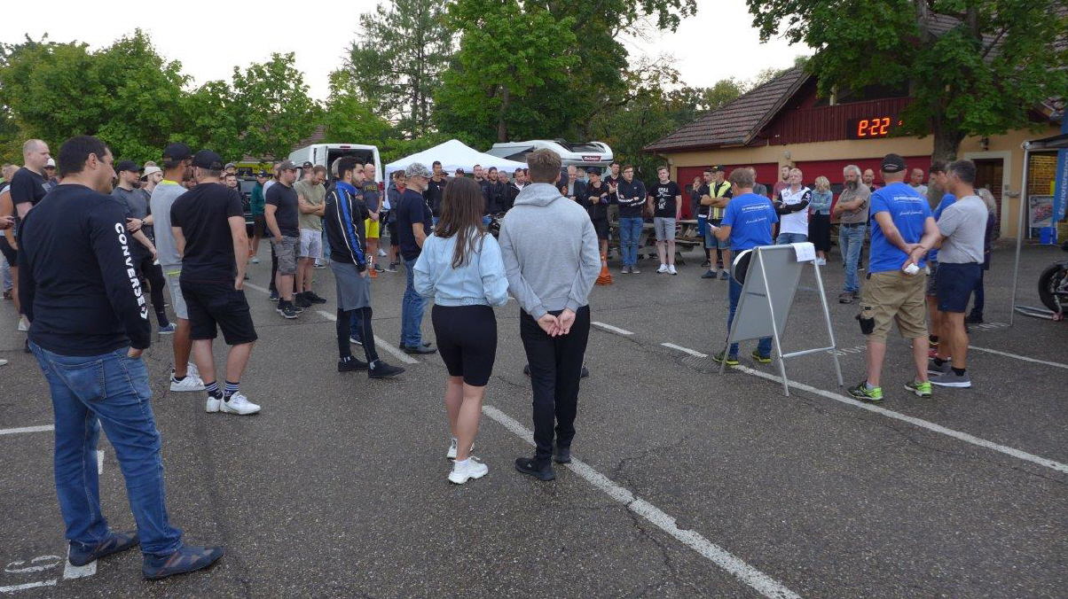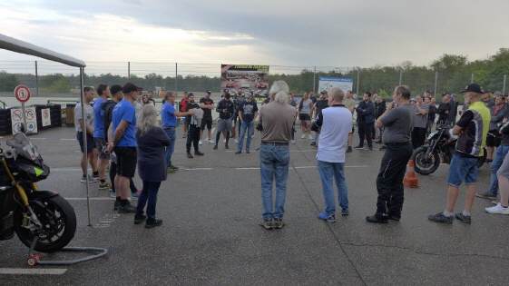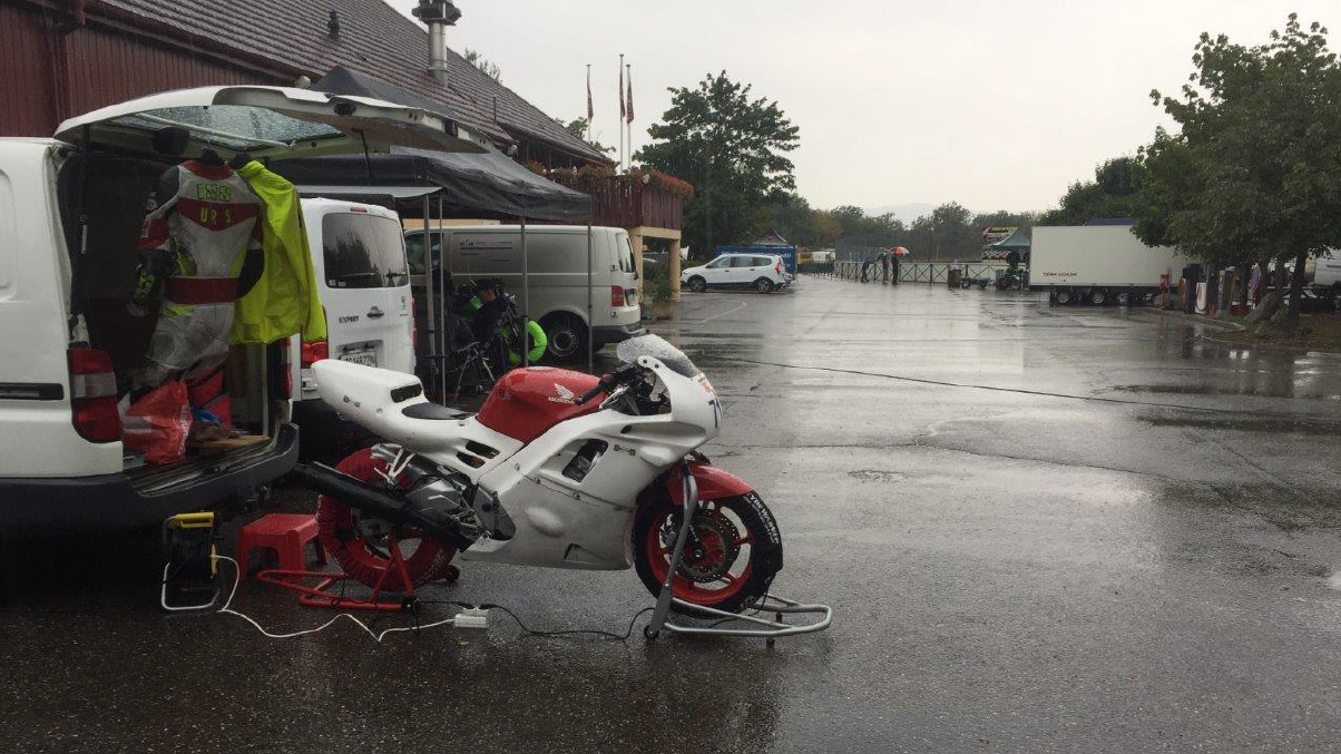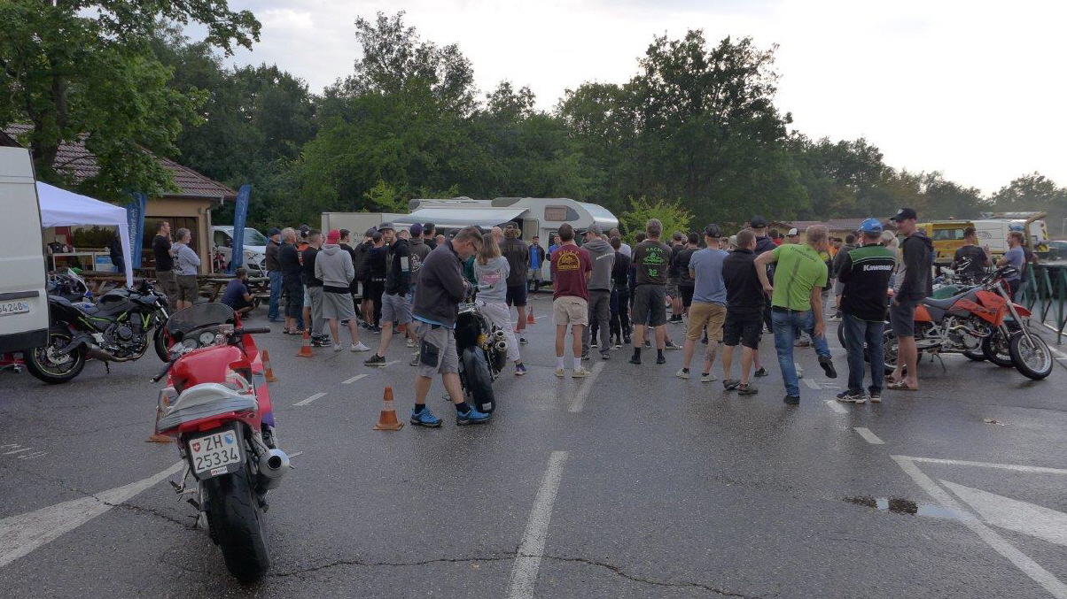 Anlässlich des TRACK DAYS vom MotoSportSchweiz/TÖFF am 9.Aug. in Anneau du Rhin, wo ich im Jahr 2000 meine Aspencade im Regen geschrottet hatte, konnte ich mich mit dieser Rundstrecke versöhnen und meldete mich gleich bei Hansruedi Züger für sein Rennstreckentraining an: So fuhr ich schon eine Woche später wieder nach Frankreich, es war ein schöner Morgen mit guter Morgenstimmung. Womit ich allerdings nicht gerechnet habe, und wohl auch niemand sonst, dass es kurz nach meiner Ankunft zu regnen begann. Der Regen hielt dann an, immer wieder startete es von neuem, was alle Slick-Fahrer dazu zwang, zu warten, und weiter zu warten ...