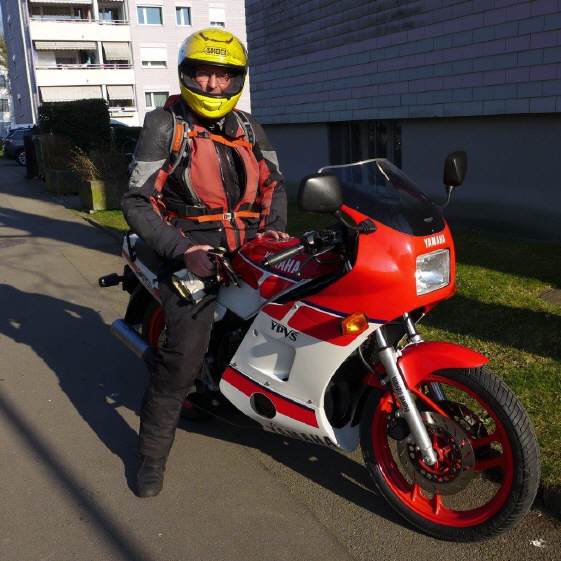nicht mehr. Er sprang auch gut an, direkt vor der Werkstatt bei Yamaha-Küng, aber nach ein paar Hundert Metern, noch bei kaltem Motor, starb er ab bei einem harten Bremsmanöver vor einem Fussgängerstreifen meines Fahrschülers, mit dem ich nicht gerechnet hatte ... Dann wollte er «ums verrecke» nicht mehr anspringen! Peinlich, peinlich ... |