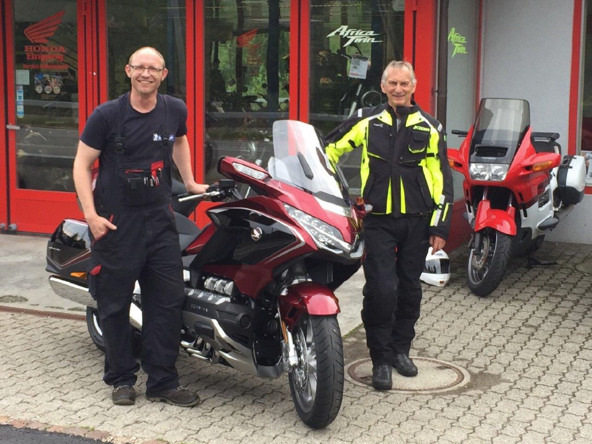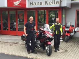 Am Freitag, 6.Juli übernahm ich mietweise eine nigel-nagel neue GoldWing Tour GL1800 DA mit DCT-Technik mit einem Km-Stand von 63 km bei Honda-Keller in Bauma, wo ich 1985 meine letzte GoldWing, eine GL1200 Aspencade gekauft habe. Im Bild: Der «neue Chef» Ivan Eberle, der die Nachfolge von Hans Keller angetreten hat, bei der Übergabe. Als ich die Maschine 3 Tage später wieder hinstellte, stand der Tacho bei 1523 Kilomter - rechne!