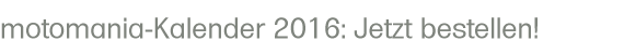 Wer einen «motomania»-Kalender 2016 haben möchte, kann ihn per Mail an urs.tobler (at) datacomm.ch oder unter Tel. 044 313 13 33 bestellenen. Er kann dann an der Tramstrasse nach telefonischer Voranmeldung abgeholt werden. Die einzelnen Monatsblätter kannst Du vergrössert ansehen, wenn Du auf das Bild «klickst»!