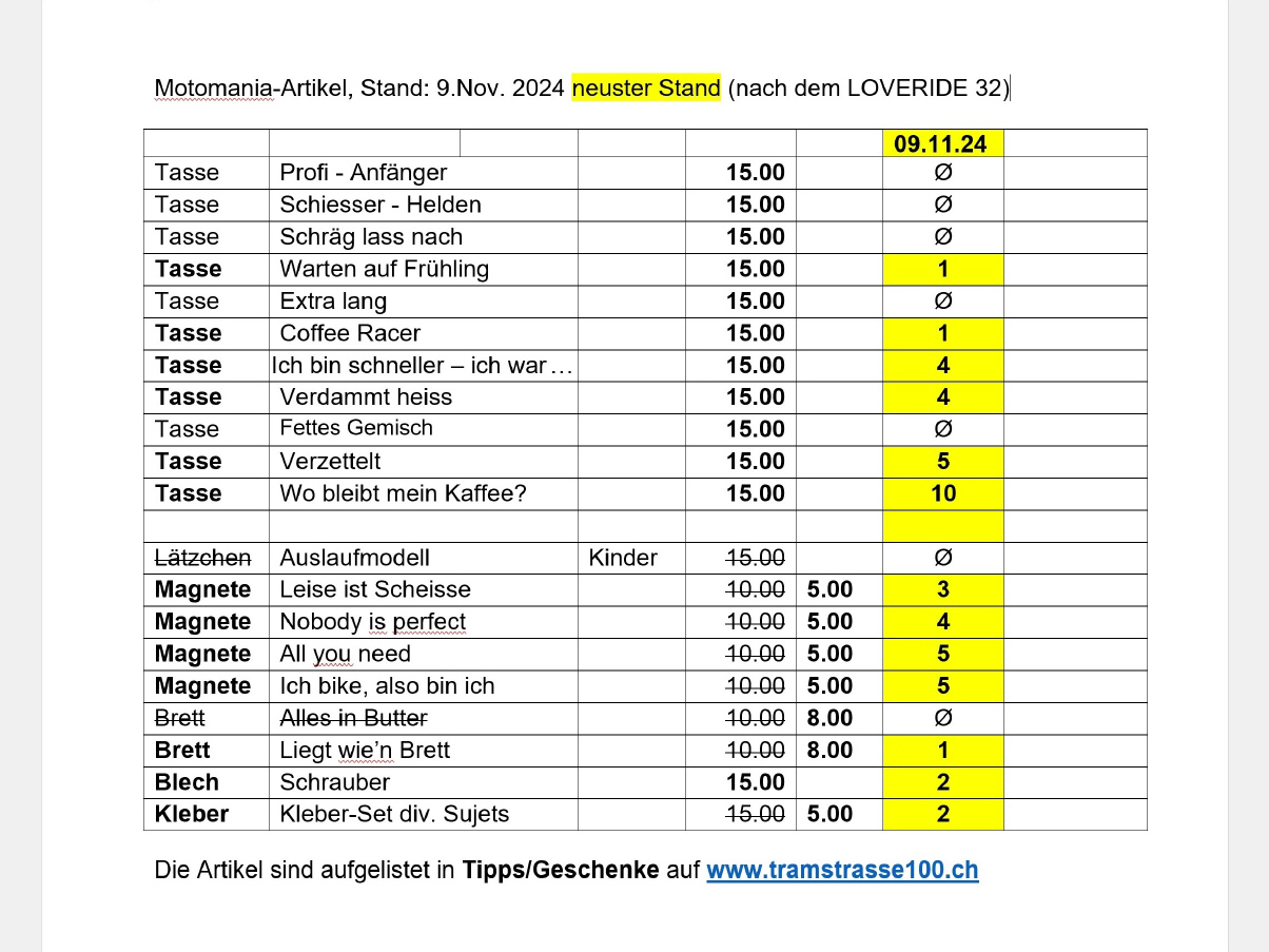Seit 2013 ist der von Hans Stalder lancierte «I-love-Töff»-Kleber bei mir zu haben. Ich bin der offizielle Herausgeber. Inzwischen haben wir neben den Klebern in zwei Grössen, den Aufnähern und Pins die Palette aufgestockt und das «I-love-Töff»-T-Shirt lanciert, in weiss erst, in 4 (inklusive Kinder-) Grössen sowie seit 2019 dasselbe in schwarz, in 3 Grössen. (ohne Kinder) Mehr dazu hier |