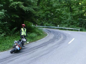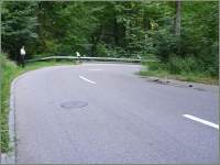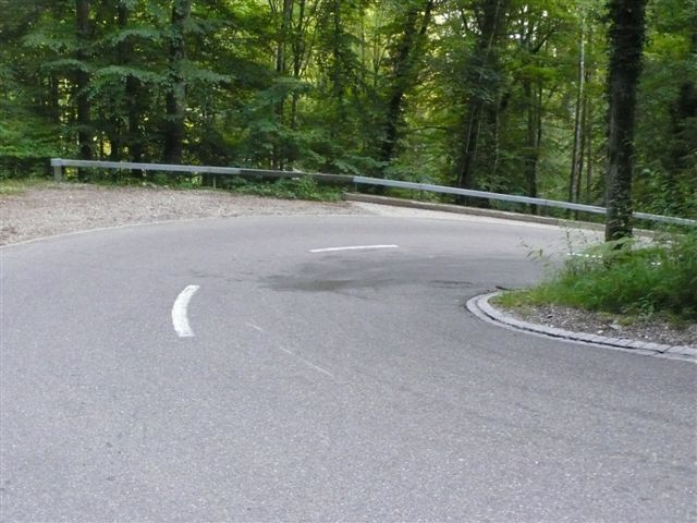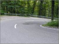 Der Abstieg nach Turbenthal besteht aus einer teilweise einsehbaren Linkskehre, die nie endet, dann einem Geschlängel, bis sich die folgende Sicht in die letzte Haarnadel nach rechts bot. Vor der Kurve kann man mit Voraussicht in den Wald hinunterschauen, ob etwas entgegen kommt. Das war dann auch mein Kommentar, bevor wir in die nicht einsehbare Rechtskurve stachen. |