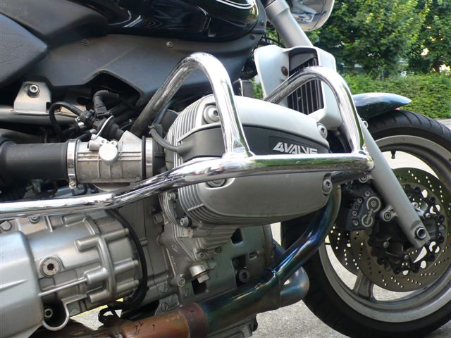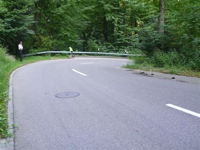 Als ich die «feuchte Stelle» sah, dachte ich: Hoffentlich ist es kein Oel! Der Gedanke war noch nicht zuende gedacht, als wir bereits lagen und nach kurzer Zeit am Strassenrand zum Stillstand kamen. Als mein Fahrschüler die «feuchte Stelle» sah, dachte er: Wasser! Nur nicht bremsen in der Kurve - das hatte er gelernt und so zog er seine (langsame) Fahrt voll durch, als seine Maschine über beide Räder rutschte und ohne Schaden zu nehmen dank dem Zylinder-umlaufenden Sturzbügel am Randstein zum Stehen (Liegen) kam. |