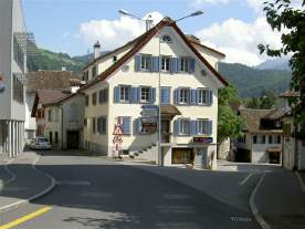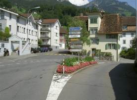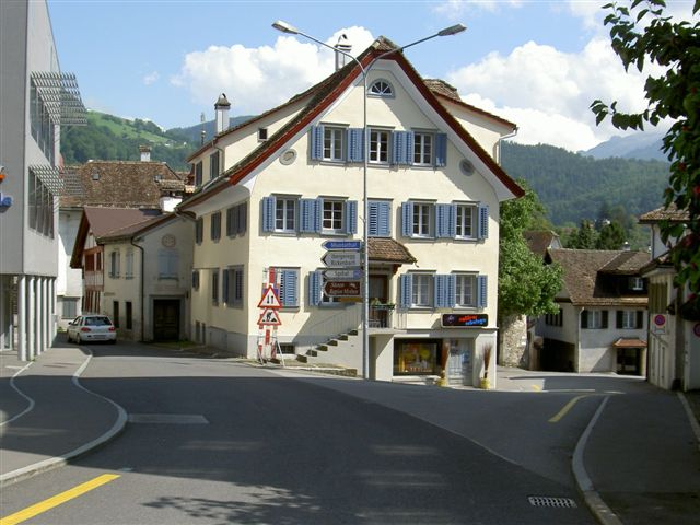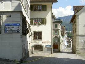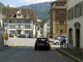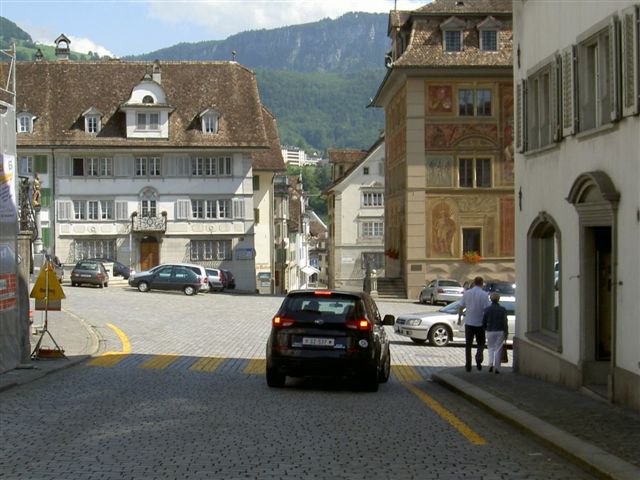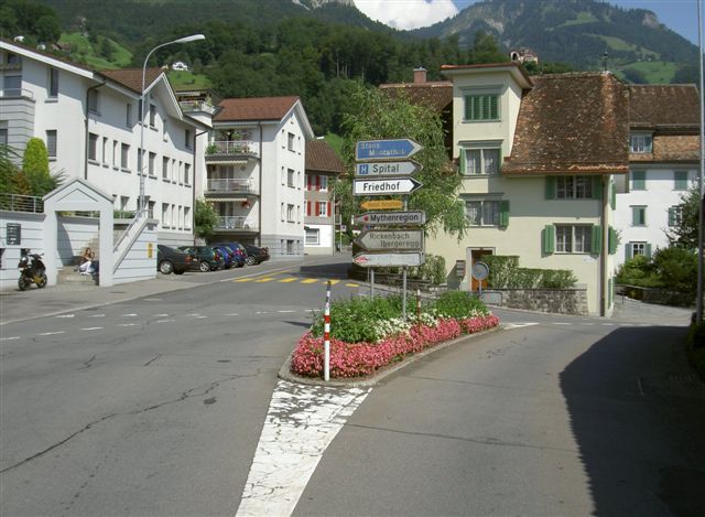 Der Weg führt im Zentrum nicht Richtung Ibergeregg, sondern über den Hauptplatz von Schwyz geradeaus (nach diesem Bild in Richtung «Spital») durch schmale Gassen schlussendlich in Richtung «Muothatal»