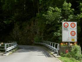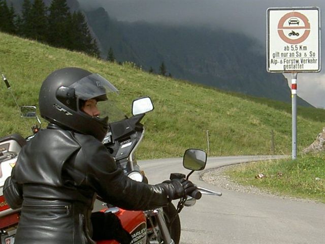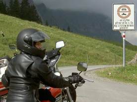 Auf der Passhöhe (oben) wird nochmals angezeigt, dass nach den nächsten 5,5 km die Strasse am Samstag und Sonntag für Motorfahrzeuge gesperrt ist. Nicht verwirren lassen und getrost talwärts weiterfahren, bis man an diese Stelle (Bild links) kommt: Hier allerdings muss angehalten werden, Motor aus und am besten Helm, Jacke und Handschuhe mal irgendwie am Motorrad anbringen, da bei voller Montur echt nicht von einem «Spaziergang» gesprochen werden kann...