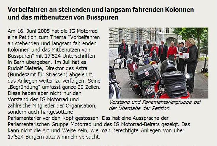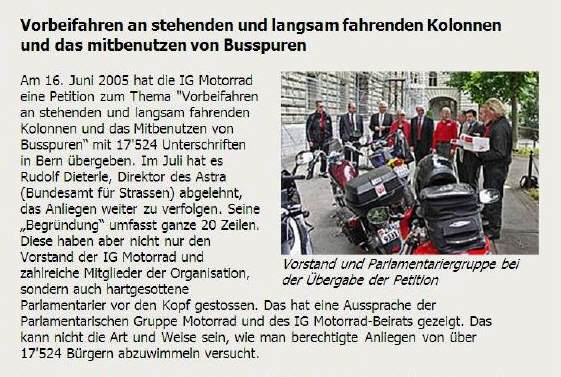 Die Initiative verlangt das, was im Alltag schon lange Tatsache ist: Dass man zwischen den Kolonnen durchfädeln kann und dass die Busspuren für die Motorräder wie für die Taxis freigegeben werden. In UNSEREM NACHBARLAND ÖSTERREICH IST DAS SEIT JAHREN LEGAL – WESHALB SOLLTE DAS NICHT AUCH IN UNSEREM LAND GEHEN? Unter dem freundlichen Verkehrsminister der letzten Jahre biss man bei solchen Anliegen immer auf Granit. Vielleicht hat seine Nachfolgerin ein bisschen mehr Erbarmen mit den Töfffahrern im Verkehrsstau.
