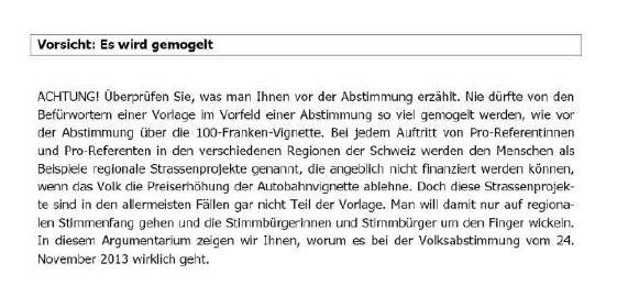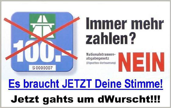Mit einem Klick auf obiges Bild landest Du auf dem Argumentarium (PDF) des Referendums-Komitees «100Fr.-Vignette-NEIN»