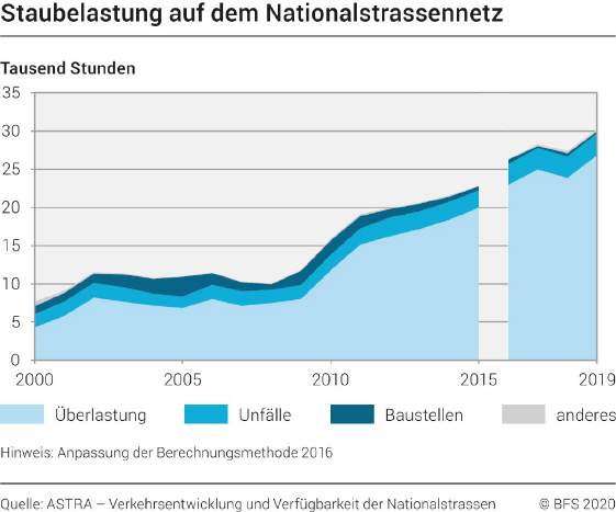 Seit 2010 hat sich die Anzahl der erfasssten Staustunden auf den Nationalstrassen beinahe verdoppelt, wobei in erster Linie die Staus wegen Verkehrsüberlastungen zugenommen haben. Inwieweit die markante Steigerung auf eine reale Zunahme der Staus zurückzuführen ist, kann jedoch nicht abschliessend beurteilt werden. Es ist davon auszugehen, dass ein beträchtlicher Teil der zusätzlich gemessenen Staustunden auf eine verbesserte Erfassung des Verkehrsgeschehens zurückzuführen ist. Zudem wurde 2016 die Berechnungsmethode angepasst.