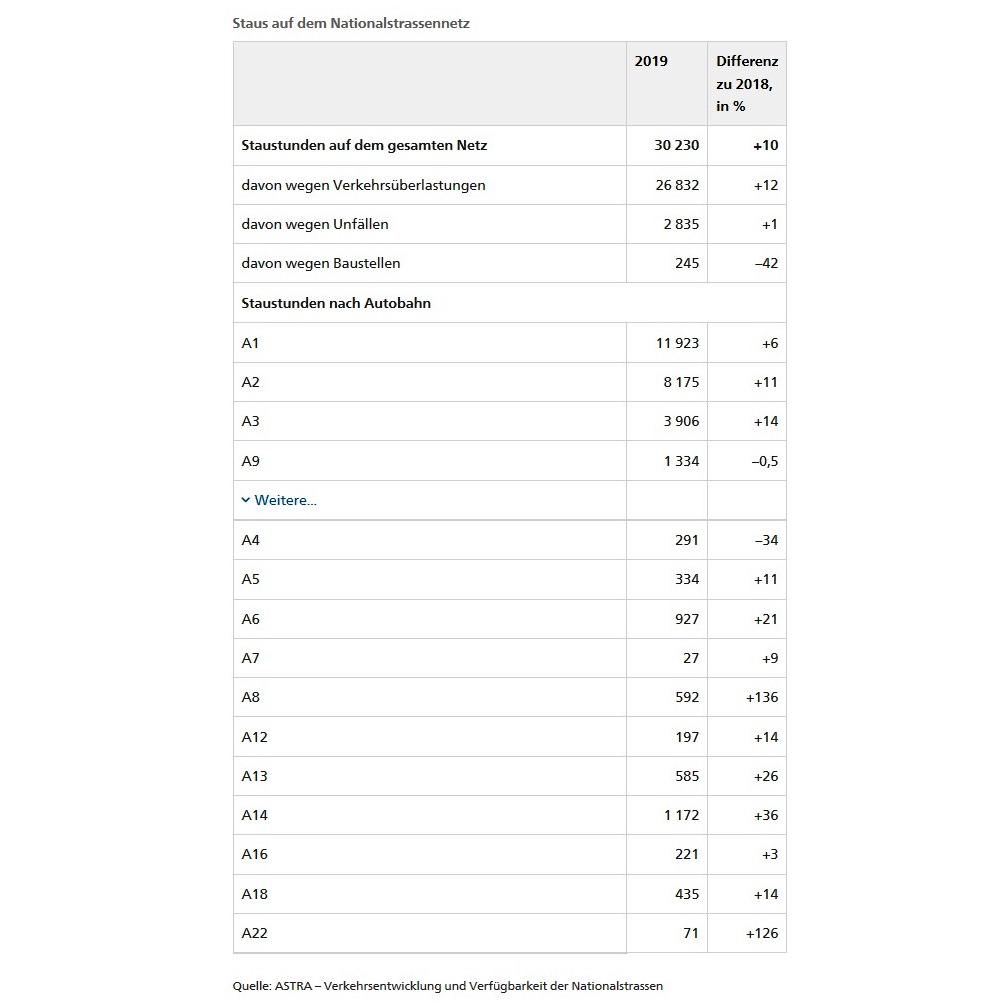 2019 wurden auf den schweizerischen Nationalstrasse 30'230 Staustunden registriert. Gegenüber 2018 entspricht dies einer Zunahme um 10%.