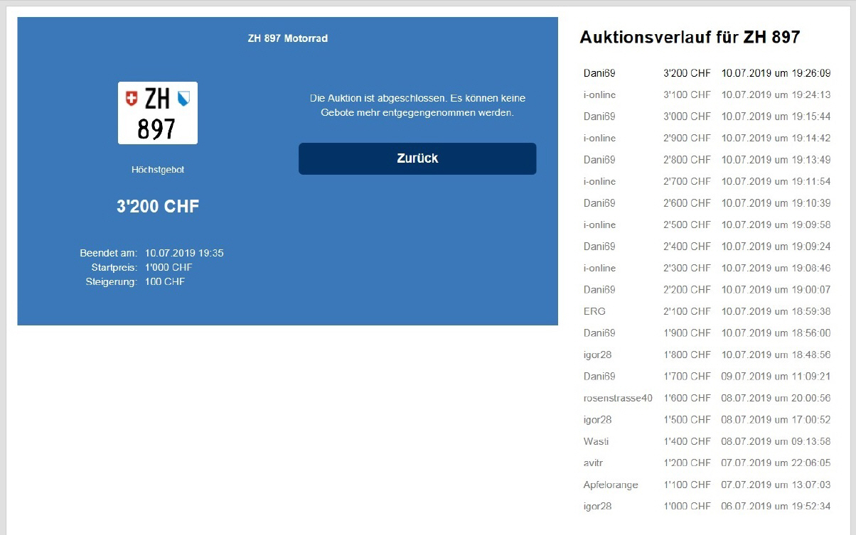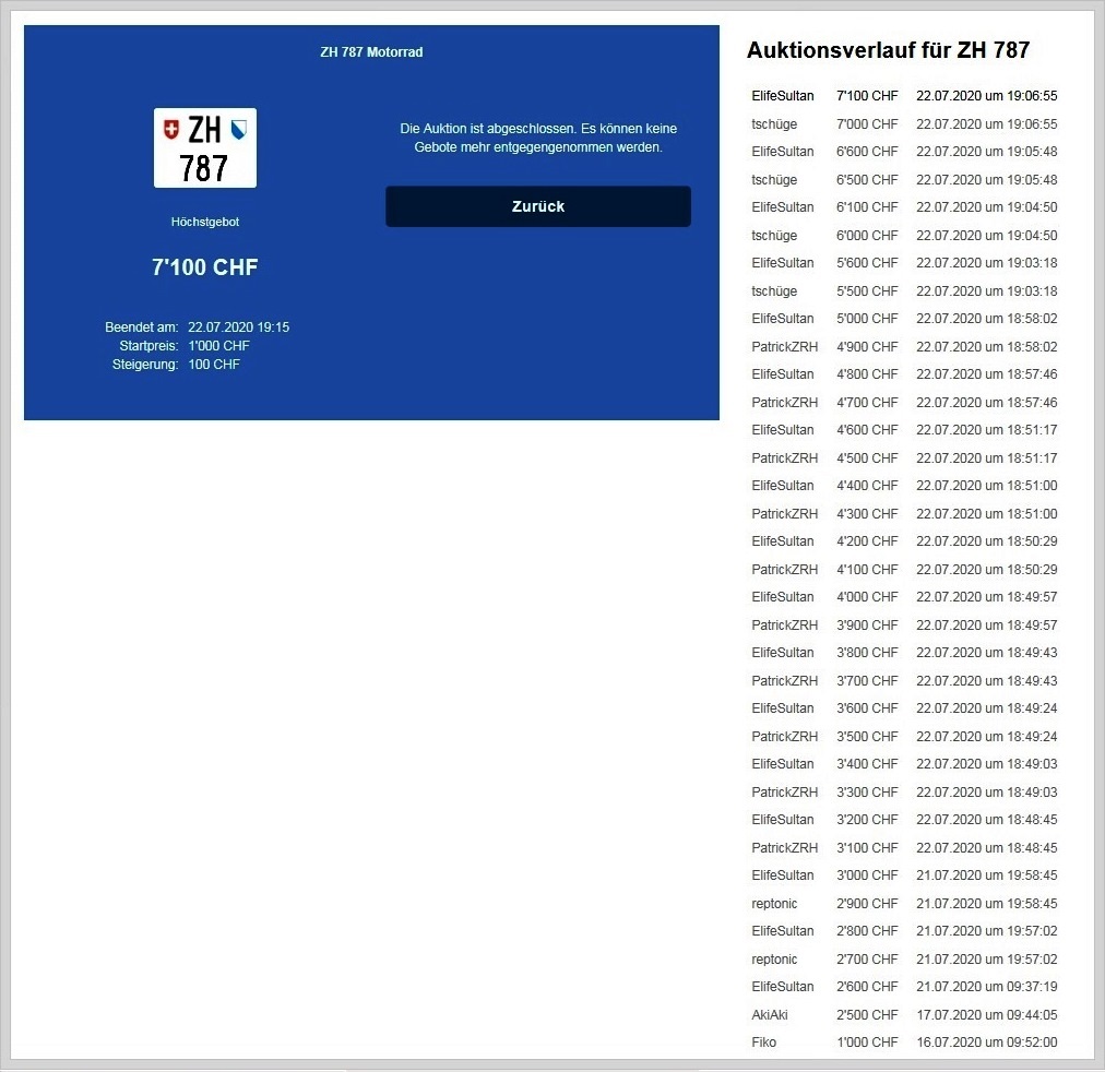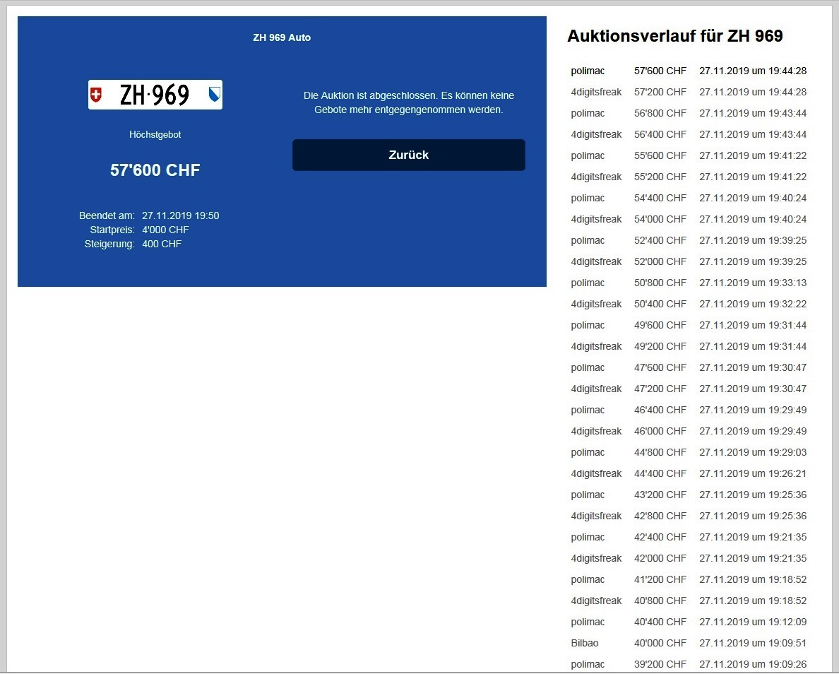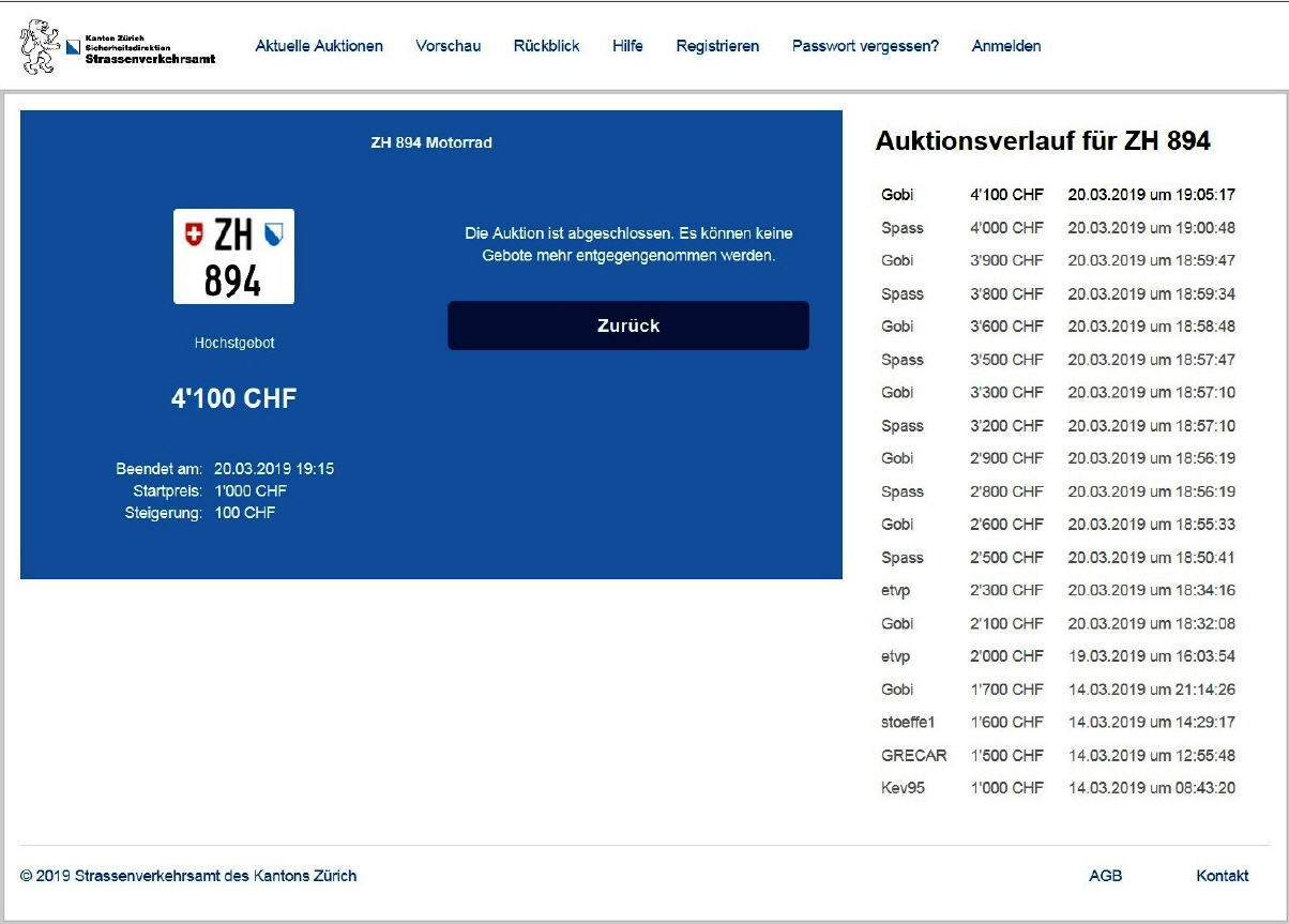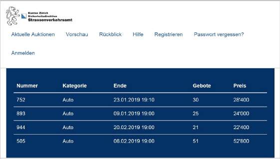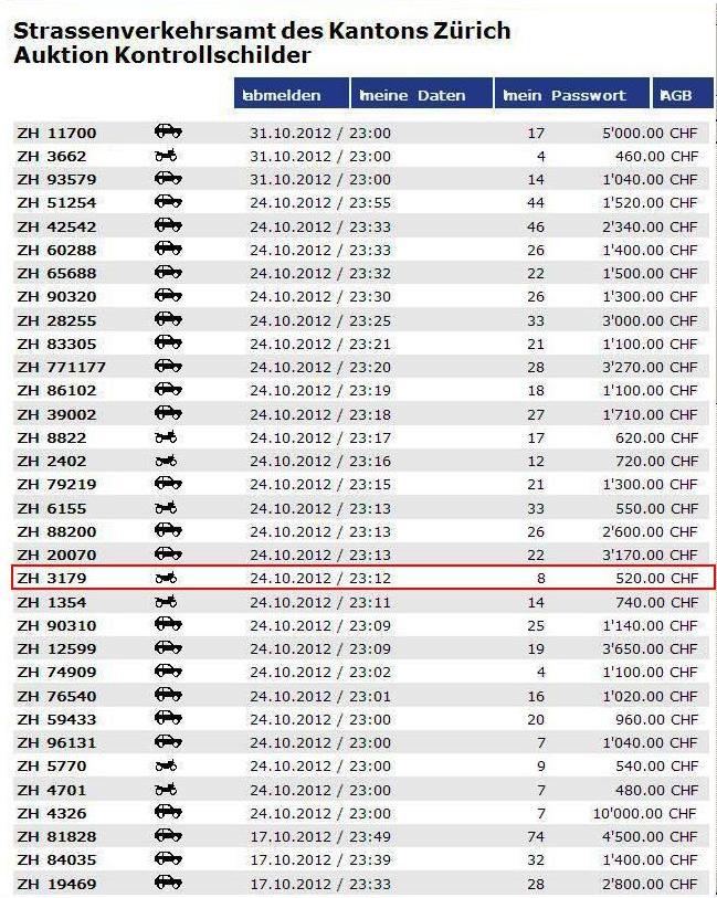 Es ist allein schon interessant, dies zu beobachten. Wenn man sich beim Strassenverkehrsamt einschreibt, bekommt man (wie ich) jeden Montag ein E-Mail zum Einloggen! Passieren tut es dann jeweils am Mittwochabend um 23.00 Uhr - aufgepasst, mitbieten ist gefährlich, Du könntest in den Rausch kommen. Also nur solange mitbieten, als es nicht (oder nur ein bisschen ...) weh tut!