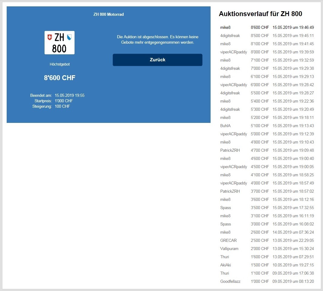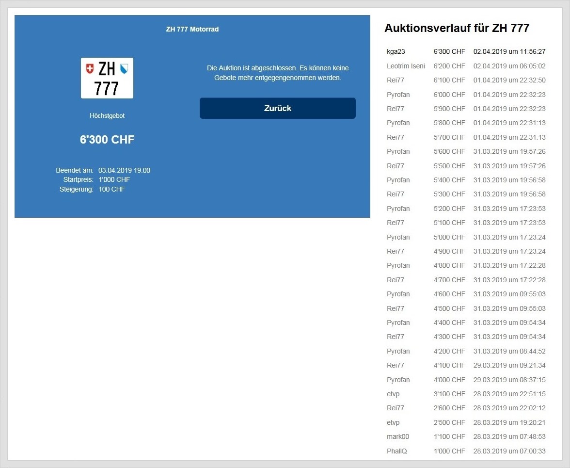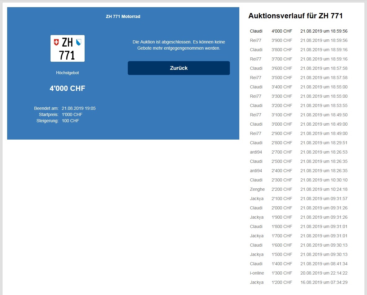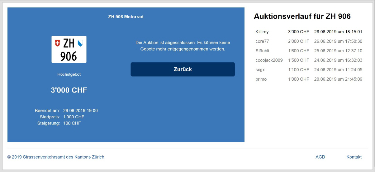 Es ist allein schon interessant, dies zu beobachten. Wenn man sich beim Strassenverkehrsamt einschreibt, bekommt man (wie ich) jeden Montag ein E-Mail zum Einloggen! Passieren tut es dann jeweils am Mittwochabend um 23.00 Uhr - aufgepasst, mitbieten ist gefährlich, Du könntest in den Rausch kommen. Also nur solange mitbieten, als es nicht (oder nur ein bisschen ...) weh tut!