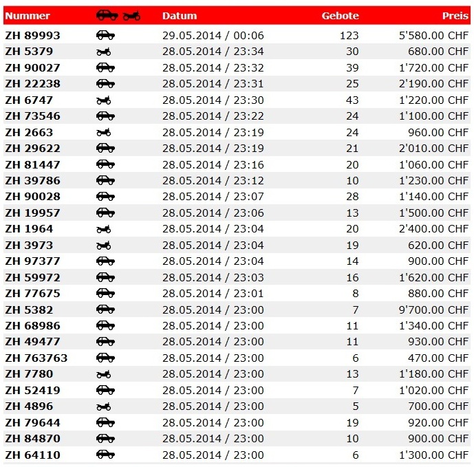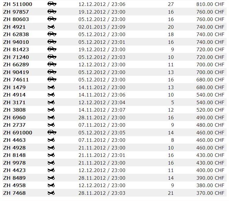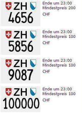 Was die Leute bereit sind, zu bezahlen für ganz besondere Nummernschild kannst Du auf der untenstehenden Liste anschauen: Während andere zufrieden sind, für 25'000 Franken sich ein neues Auto kaufen zu können, gibt es welche, die schon nur für das Nummernschild bereiot sind, 40'100 Franken zu bezahlen! Ob der glückliche Besitzer wenigstens auch das entsprechende Auto hat, um wohl «seinen Jahrgang» ZH 1980 dranzuhängen?