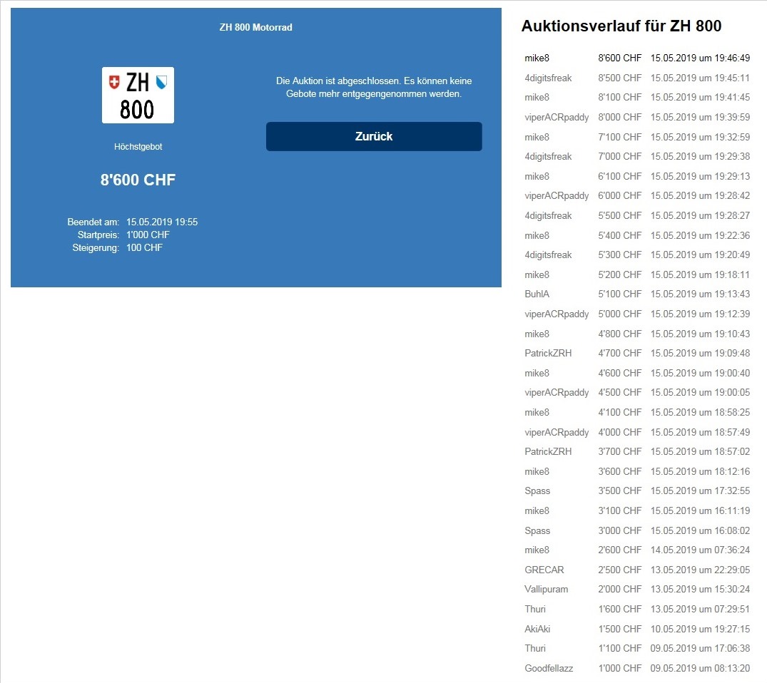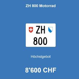 Am 15.5.2019 wurde im Kanton Zürich das fünfte 3-stellige TÖFF-Nummernschild ausgegeben - in der Auktion dem Höchstbietenden: Verfolge den Verlauf «ZH 800