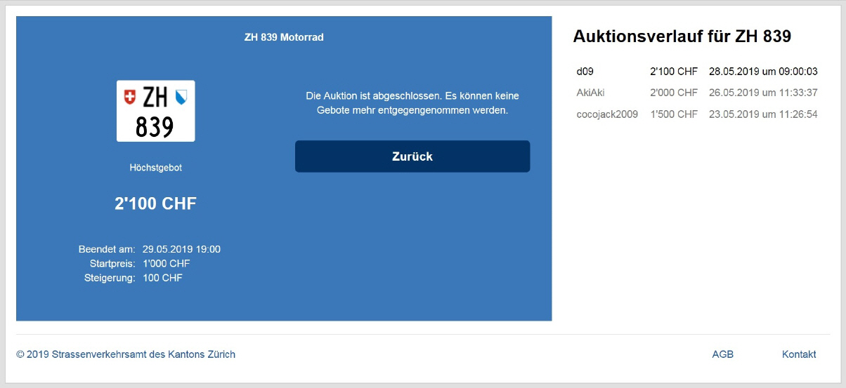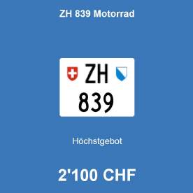 Am 29.5.2019 wurde im Kanton Zürich das sechste 3-stellige TÖFF-Nummernschild ausgegeben - in der Auktion dem Höchstbietenden: Verfolge den Verlauf «ZH 839