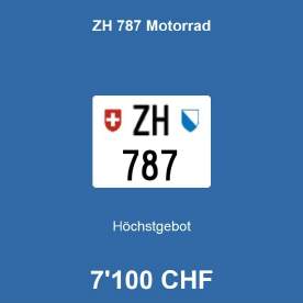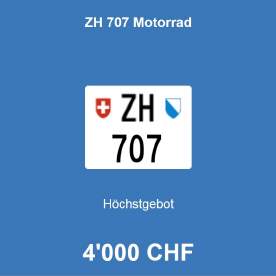 Am 12.6.2019 wurde im Kanton Zürich das siebte 3-stellige TÖFF-Nummernschild ausgegeben - in der Auktion dem Höchstbietenden: Verfolge den Verlauf «ZH 707