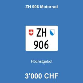 Am 26.6.2019 wurde im Kanton Zürich das achte 3-stellige TÖFF-Nummernschild ausgegeben - in der Auktion dem Höchstbietenden: Verfolge den Verlauf «ZH 906