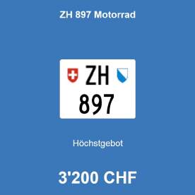 Am 10.7.2019 wurde im Kanton Zürich das neunte 3-stellige TÖFF-Nummernschild ausgegeben - in der Auktion dem Höchstbietenden: Verfolge den Verlauf «ZH 897