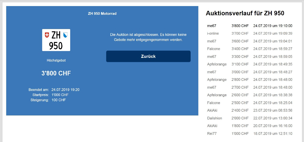 Am 24.7.2019 wurde im Kanton Zürich das zehnte 3-stellige TÖFF-Nummernschild ausgegeben - in der Auktion dem Höchstbietenden: Verfolge den Verlauf «ZH 950