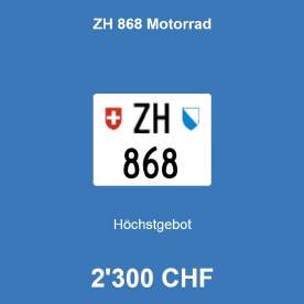 Am 4.9.2019 wurde im Kanton Zürich das zwölfte 3-stellige TÖFF-Nummernschild ausgegeben - in der Auktion dem Höchstbietenden: Verfolge den Verlauf «ZH 868