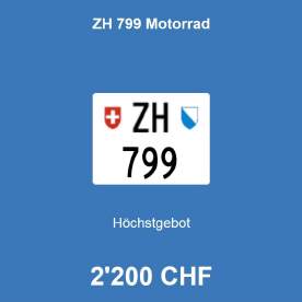 Am 18.9.2019 wurde im Kanton Zürich das zwölfte 3-stellige TÖFF-Nummernschild ausgegeben - in der Auktion dem Höchstbietenden: Verfolge den Verlauf «ZH 799
