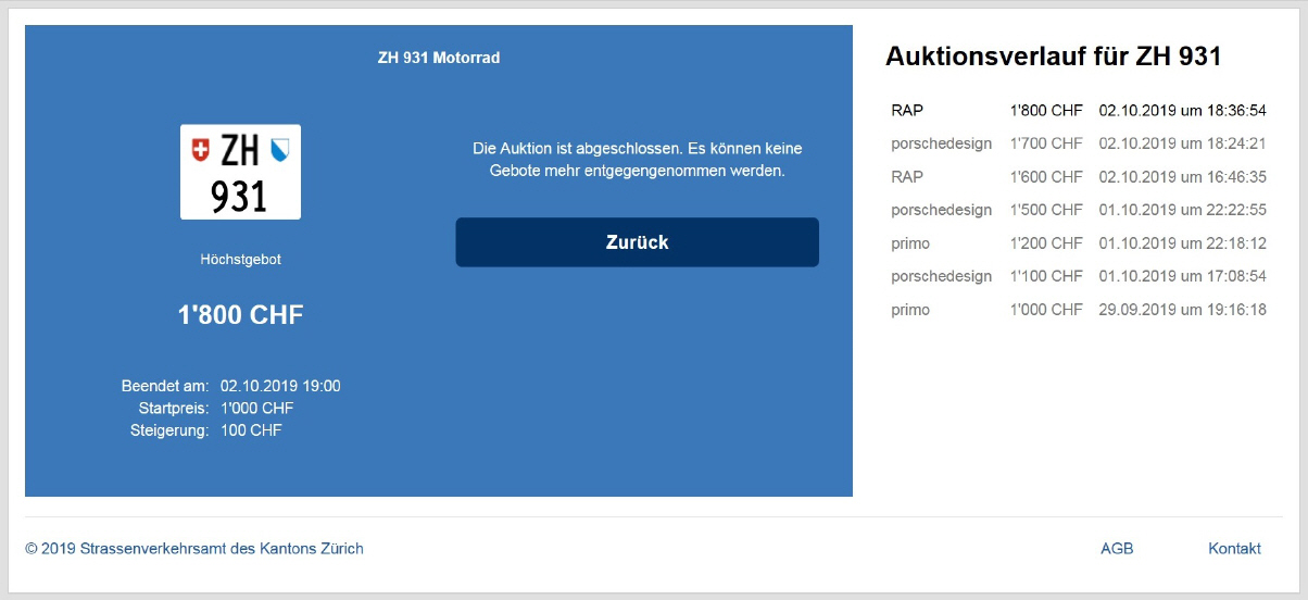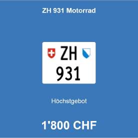 Am 2.10.2019 wurde im Kanton Zürich das zwölfte 3-stellige TÖFF-Nummernschild ausgegeben - in der Auktion dem Höchstbietenden: Verfolge den Verlauf «ZH 931