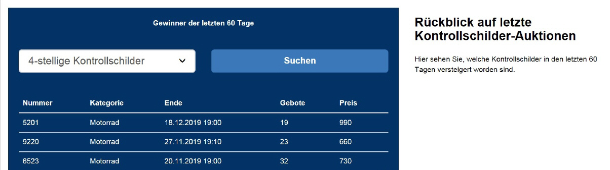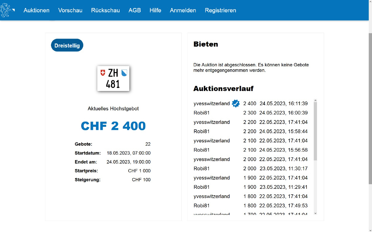 Es ist allein schon interessant, dies zu beobachten. Wenn man sich beim Strassenverkehrsamt einschreibt, bekommt man (wie ich) jeden Montag ein E-Mail zum Einloggen! Passieren tut es dann jeweils am Mittwochabend um 23.00 Uhr - aufgepasst, mitbieten ist gefährlich, Du könntest in den Rausch kommen. Also nur solange mitbieten, als es nicht (oder nur ein bisschen ...) weh tut!