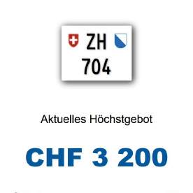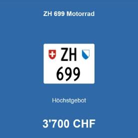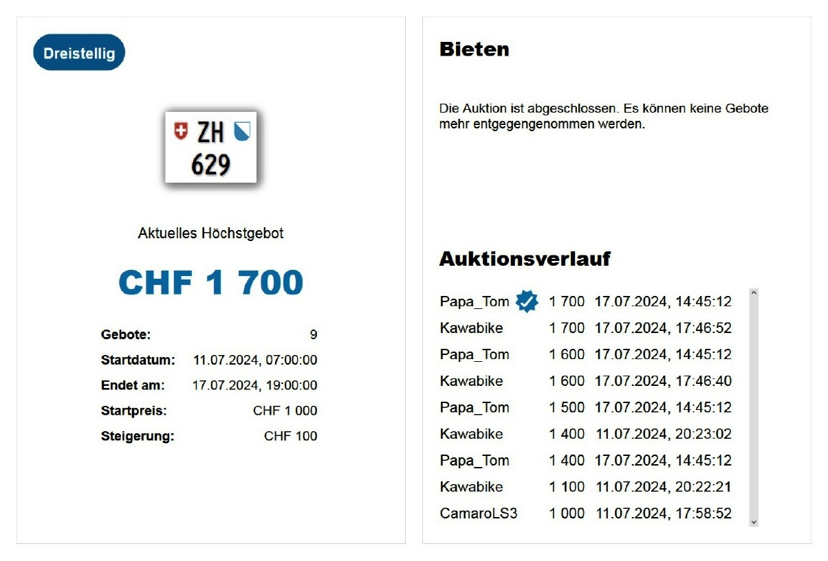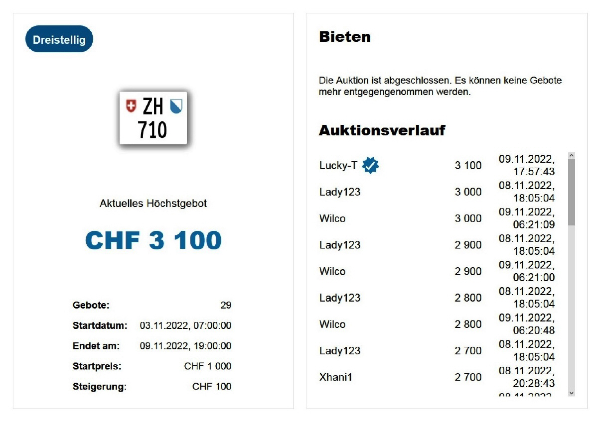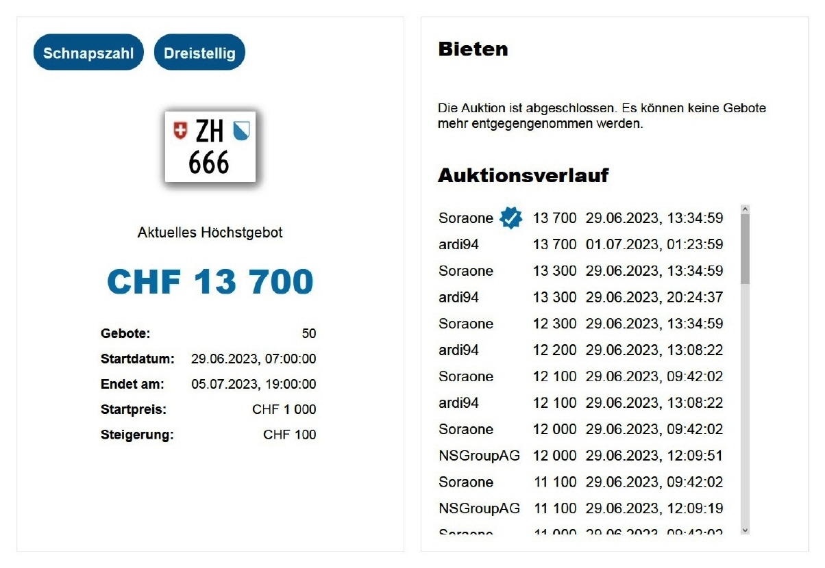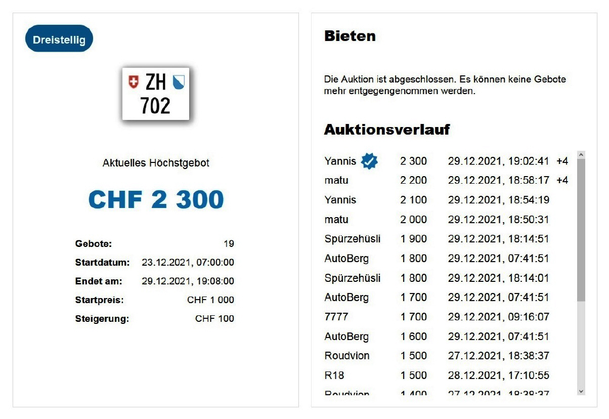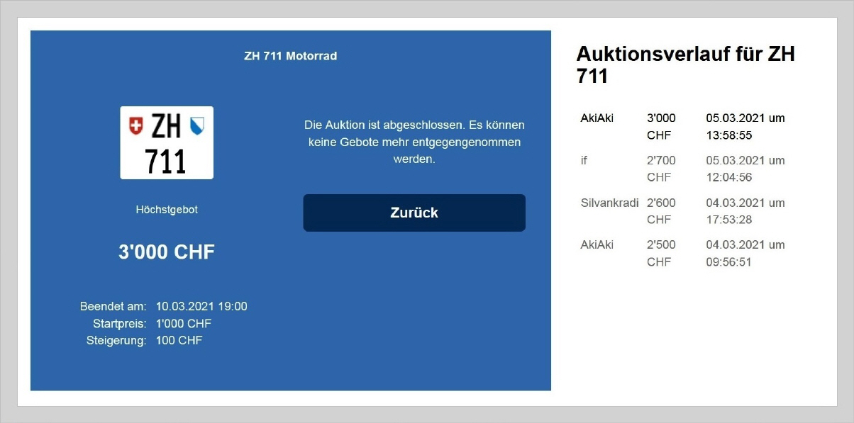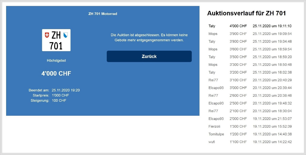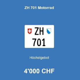 Am 25.11.2020 wurde im Kanton Zürich das 3-stellige TÖFF-Nummernschild ausgegeben - in der Auktion ging es für Fr. 4000.- weg: Auch hier boten sich zwei Bieter hoch! Verfolge den Verlauf vom «ZH 701