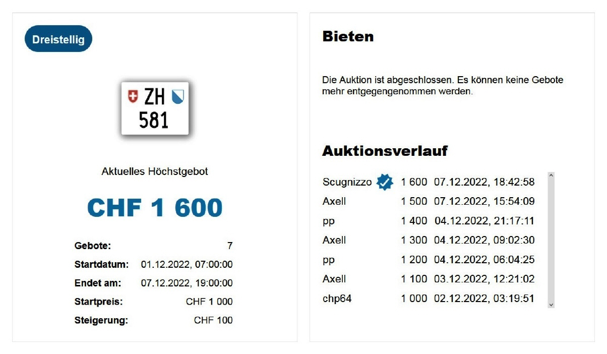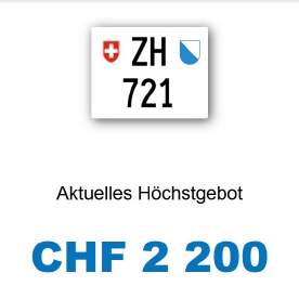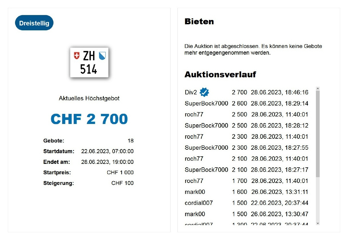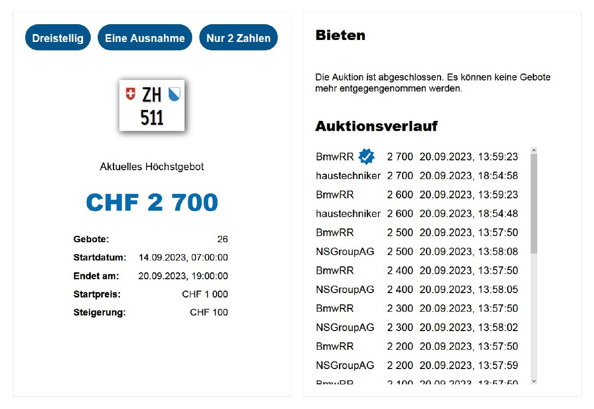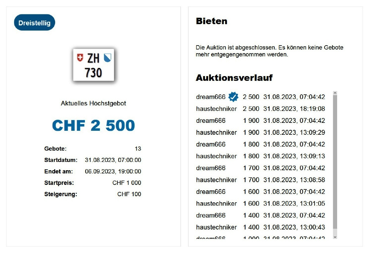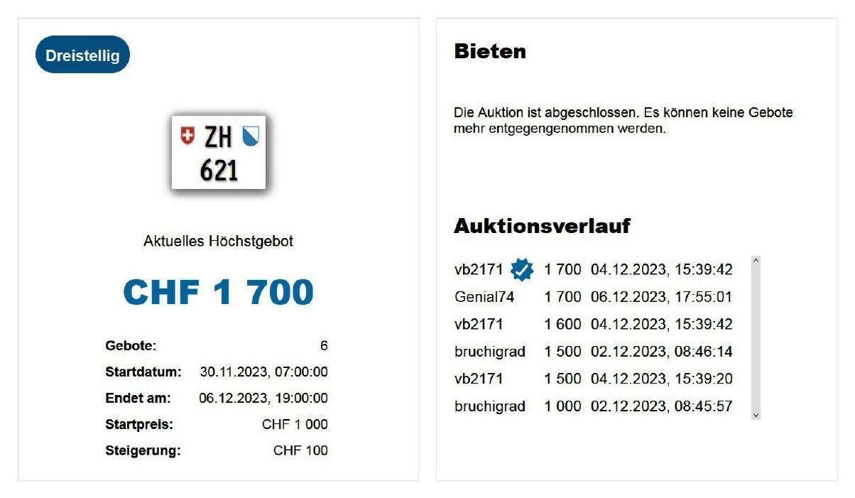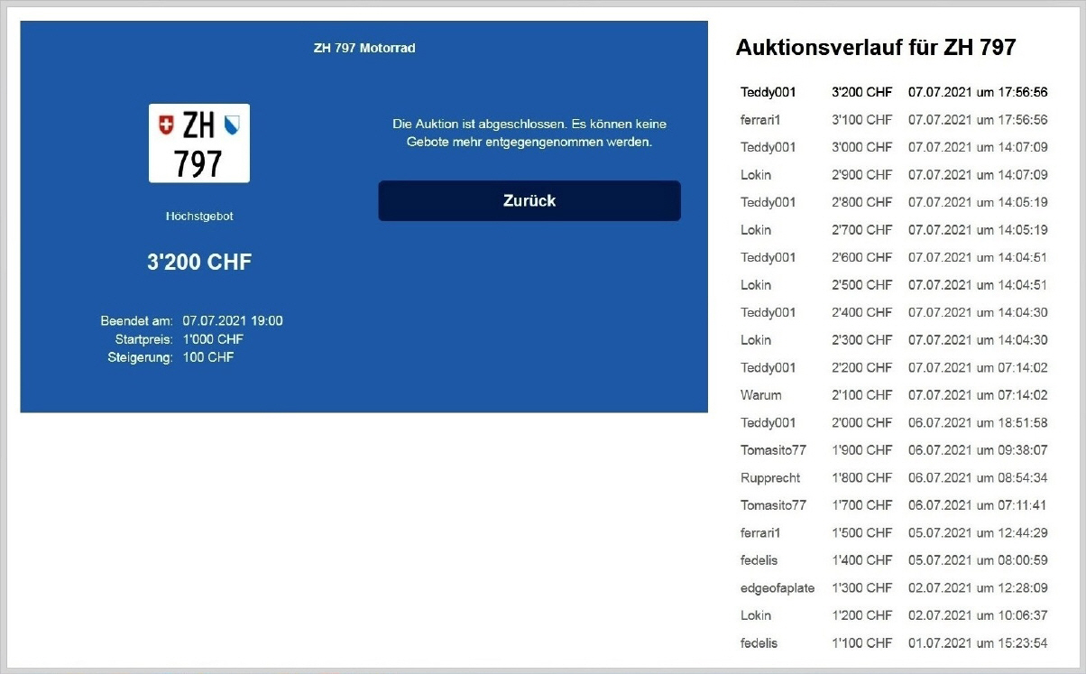 Am 25.11.2020 wurde im Kanton Zürich das 3-stellige TÖFF-Nummernschild ausgegeben - in der Auktion ging es für Fr. 4000.- weg: Auch hier boten sich zwei Bieter hoch! Verfolge den Verlauf vom «ZH 701