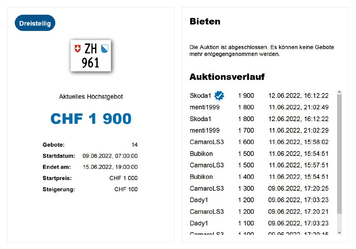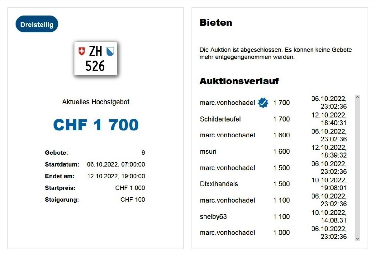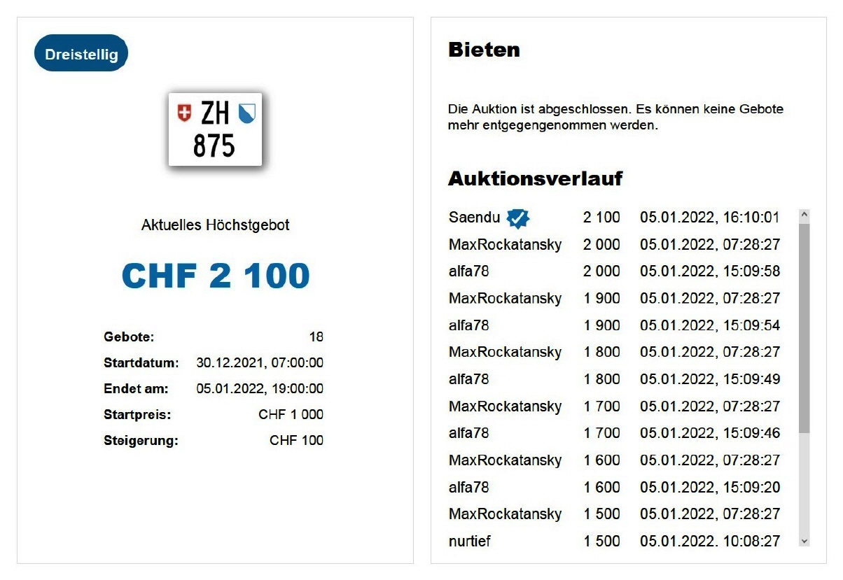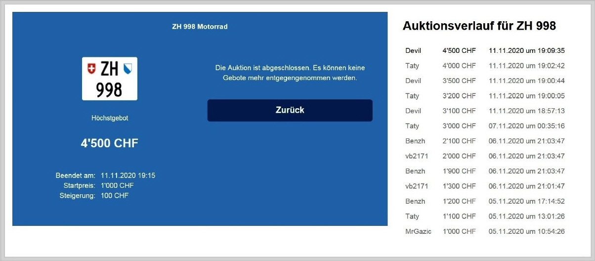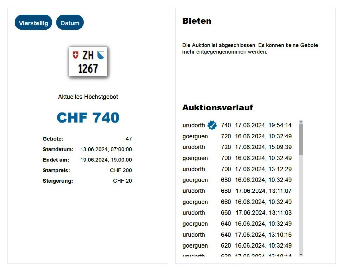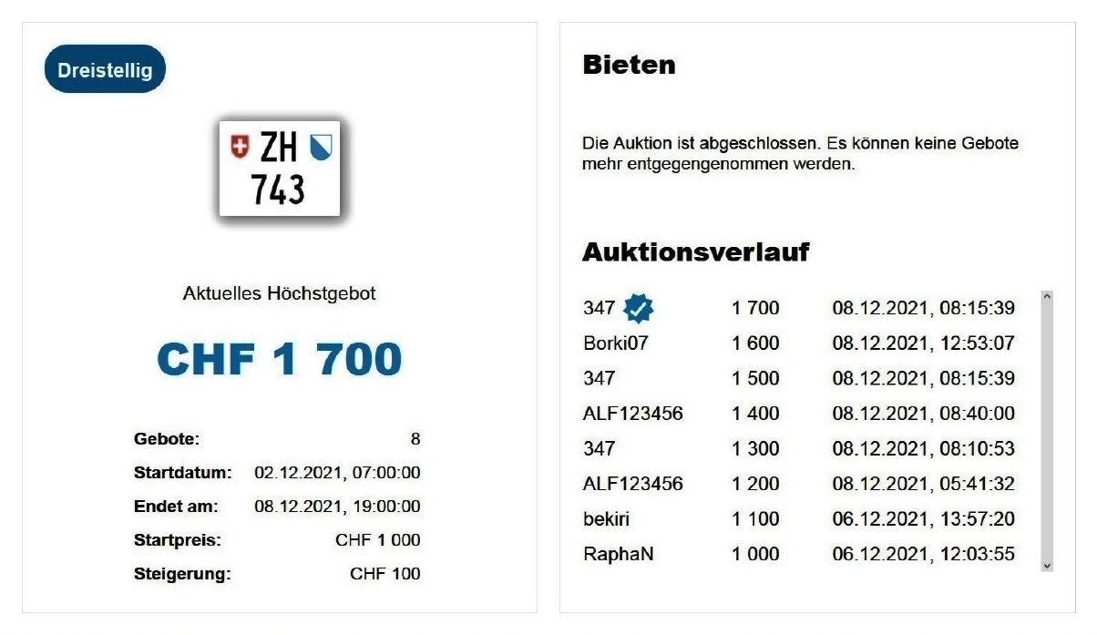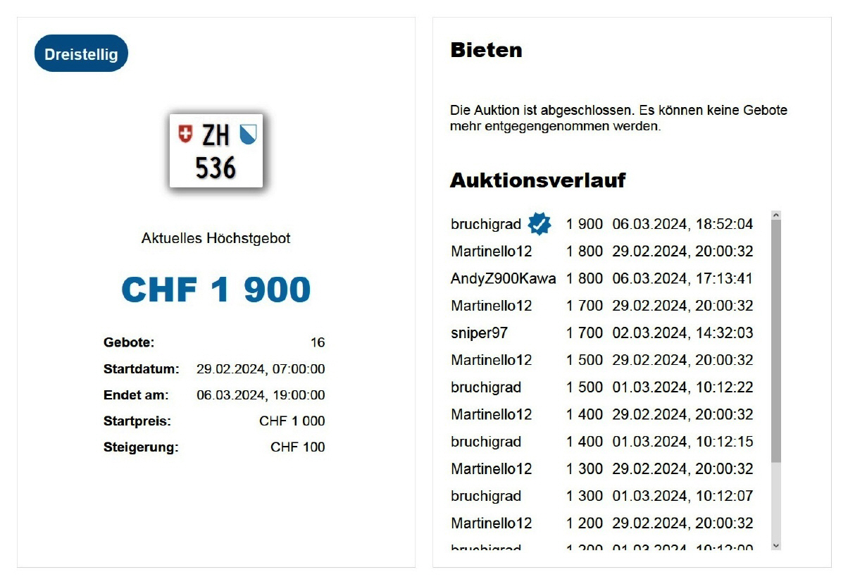 Am 25.11.2020 wurde im Kanton Zürich das 3-stellige TÖFF-Nummernschild ausgegeben - in der Auktion ging es für Fr. 4000.- weg: Auch hier boten sich zwei Bieter hoch! Verfolge den Verlauf vom «ZH 701