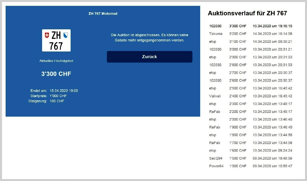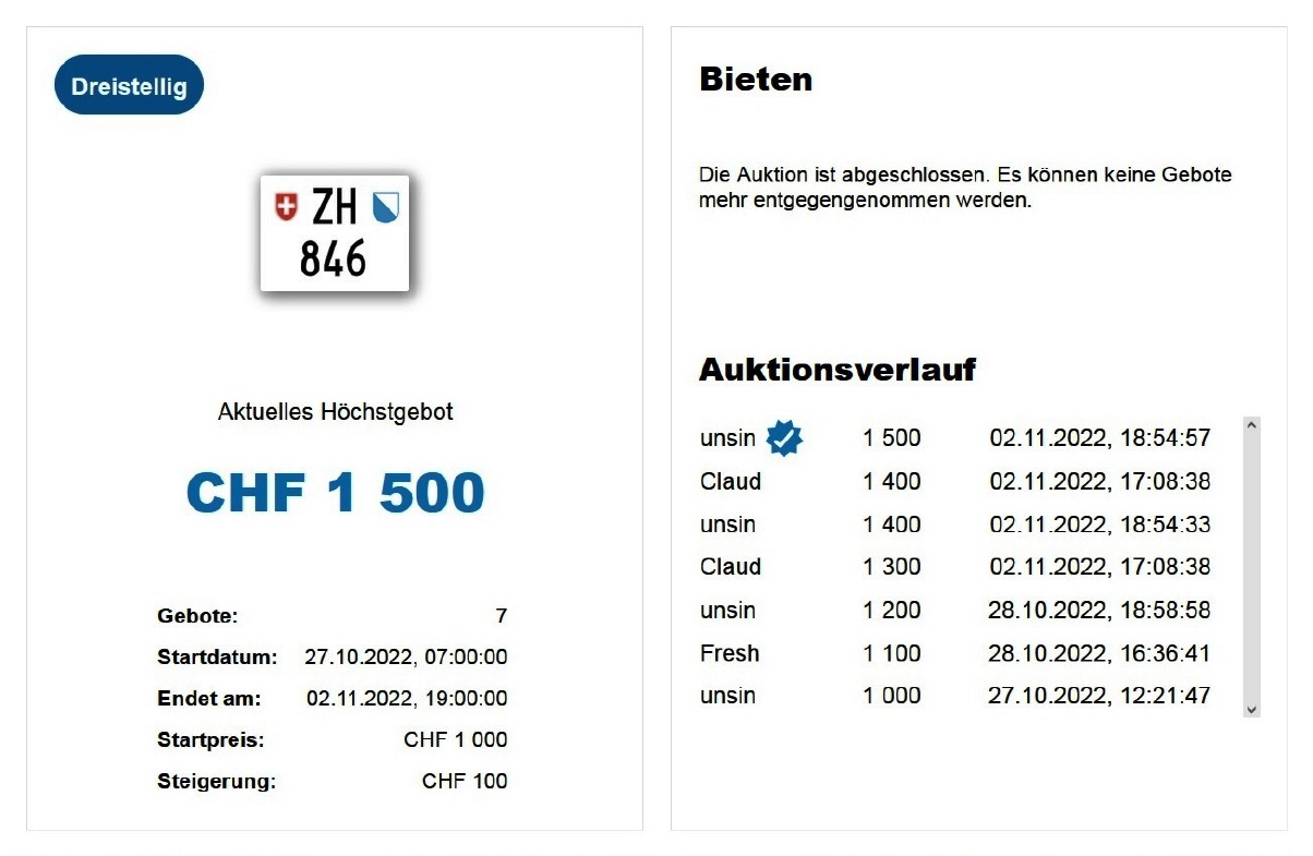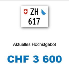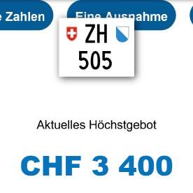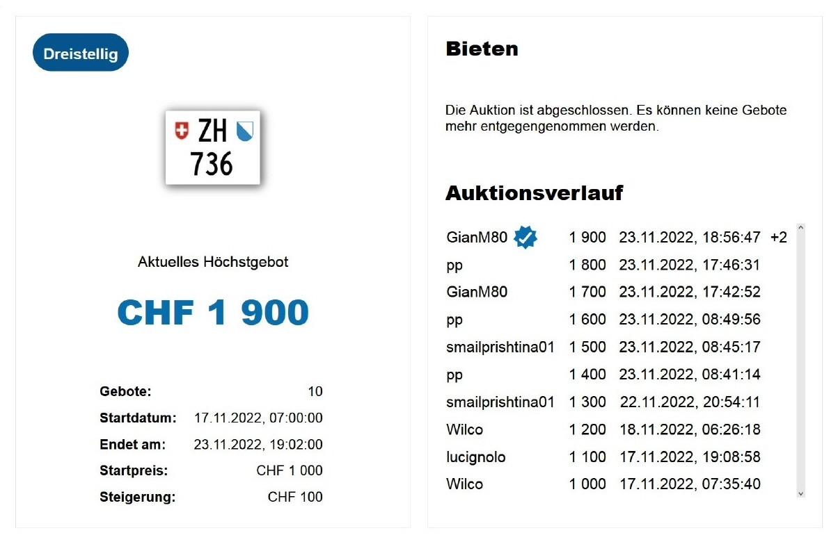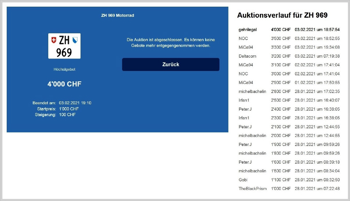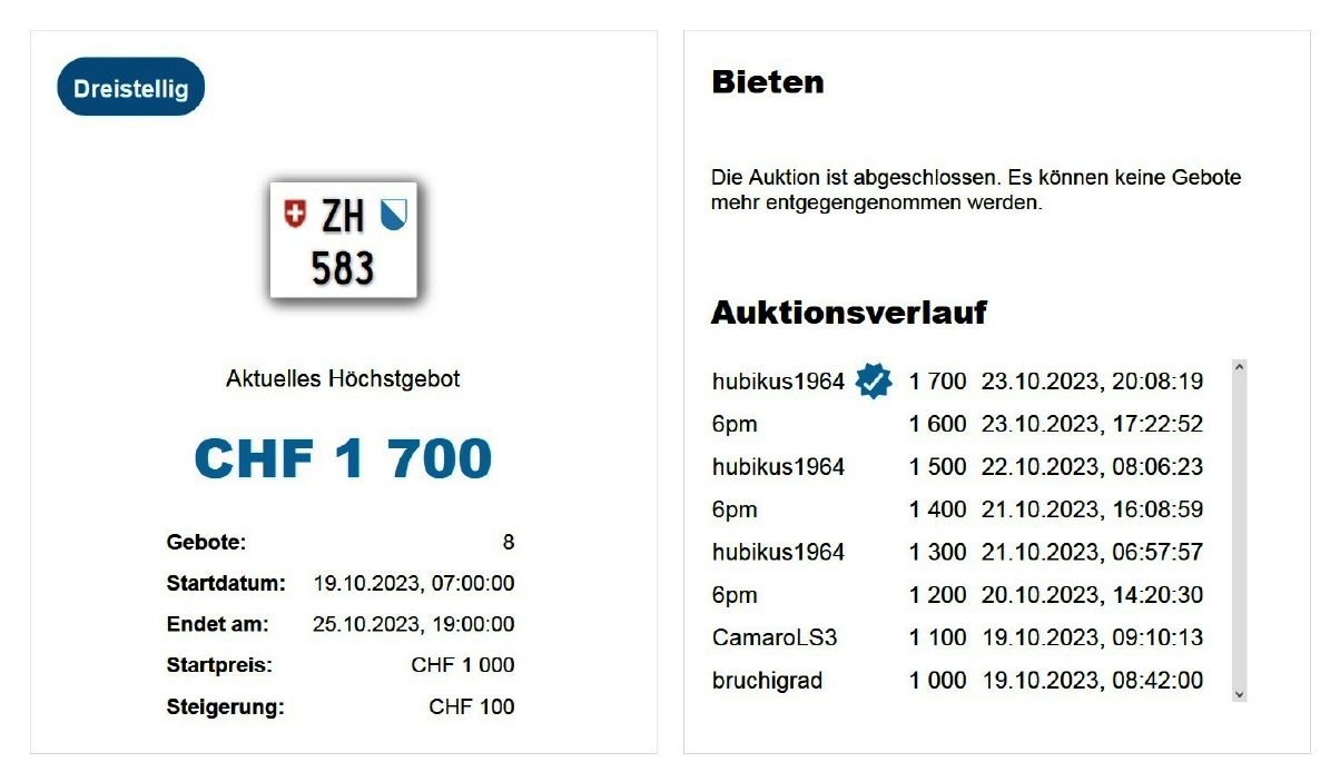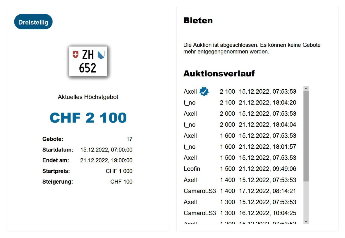 Am 25.11.2020 wurde im Kanton Zürich das 3-stellige TÖFF-Nummernschild ausgegeben - in der Auktion ging es für Fr. 4000.- weg: Auch hier boten sich zwei Bieter hoch! Verfolge den Verlauf vom «ZH 701
