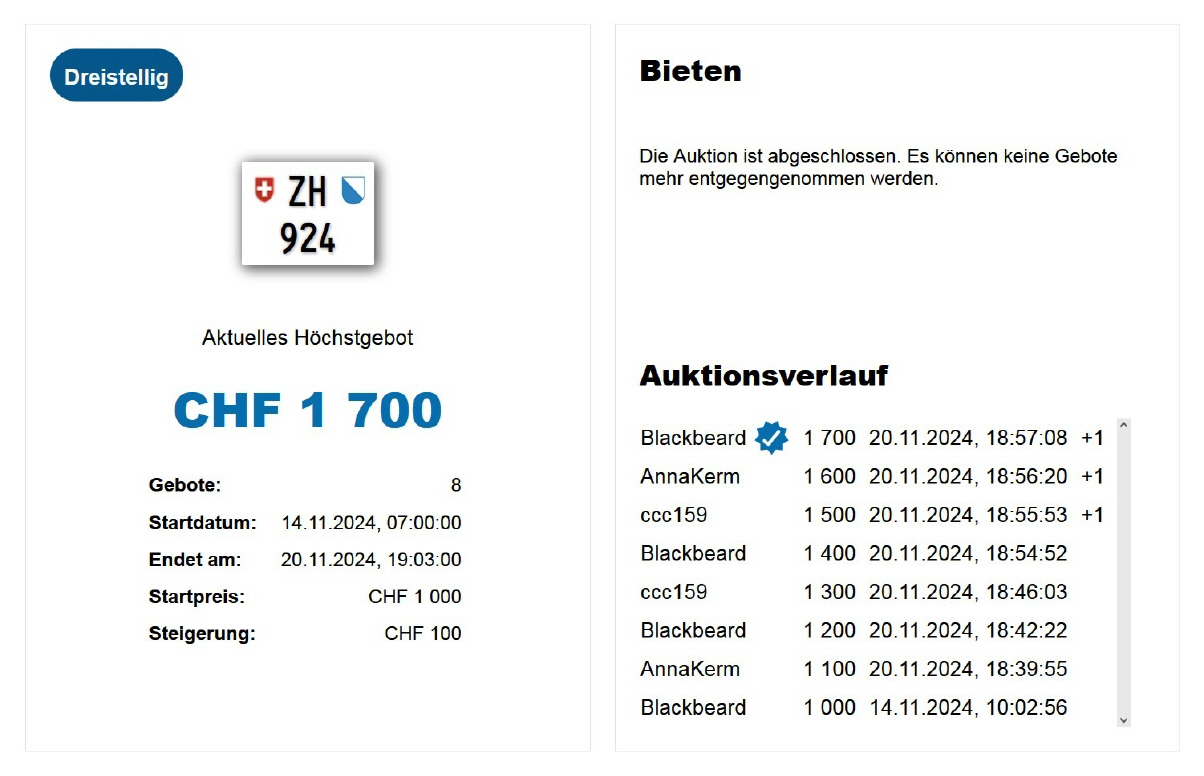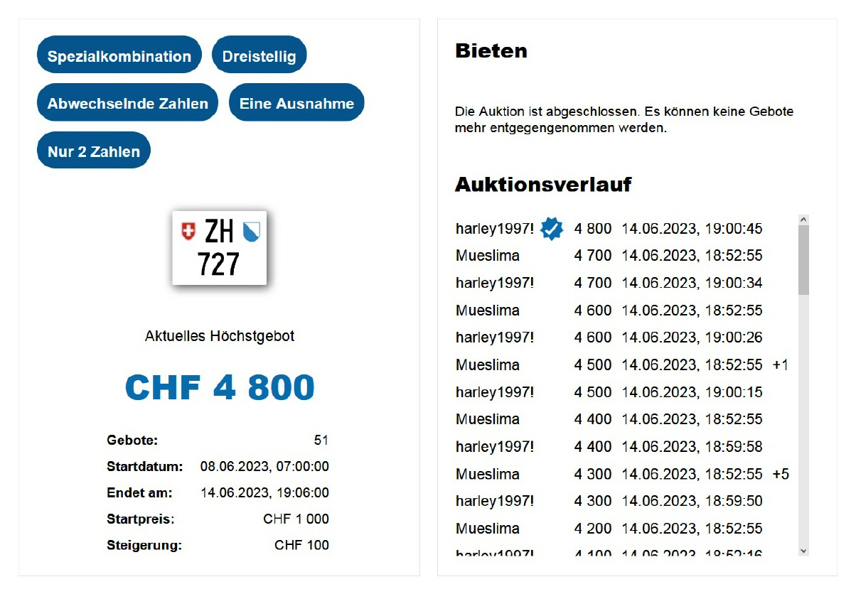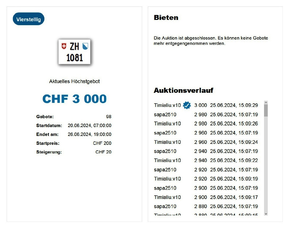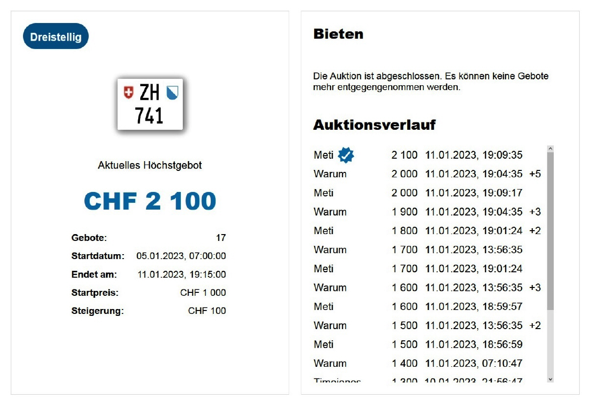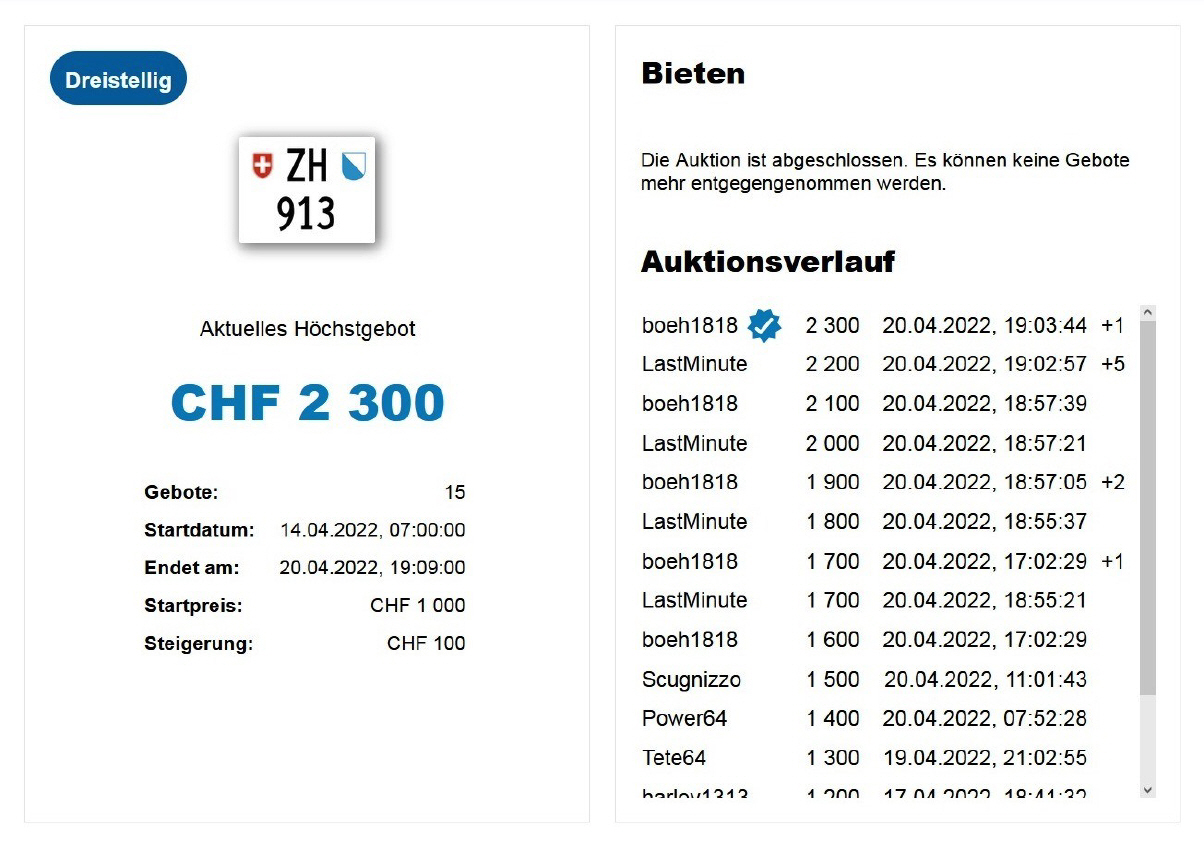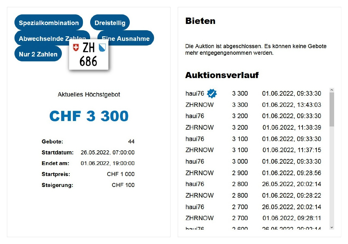 Am 25.11.2020 wurde im Kanton Zürich das 3-stellige TÖFF-Nummernschild ausgegeben - in der Auktion ging es für Fr. 4000.- weg: Auch hier boten sich zwei Bieter hoch! Verfolge den Verlauf vom «ZH 701
