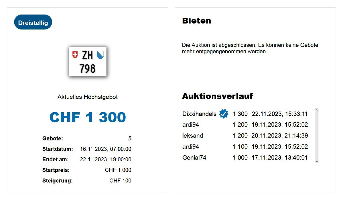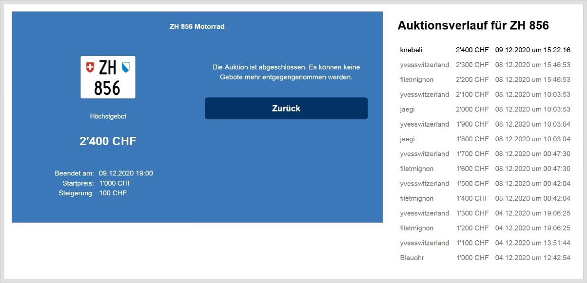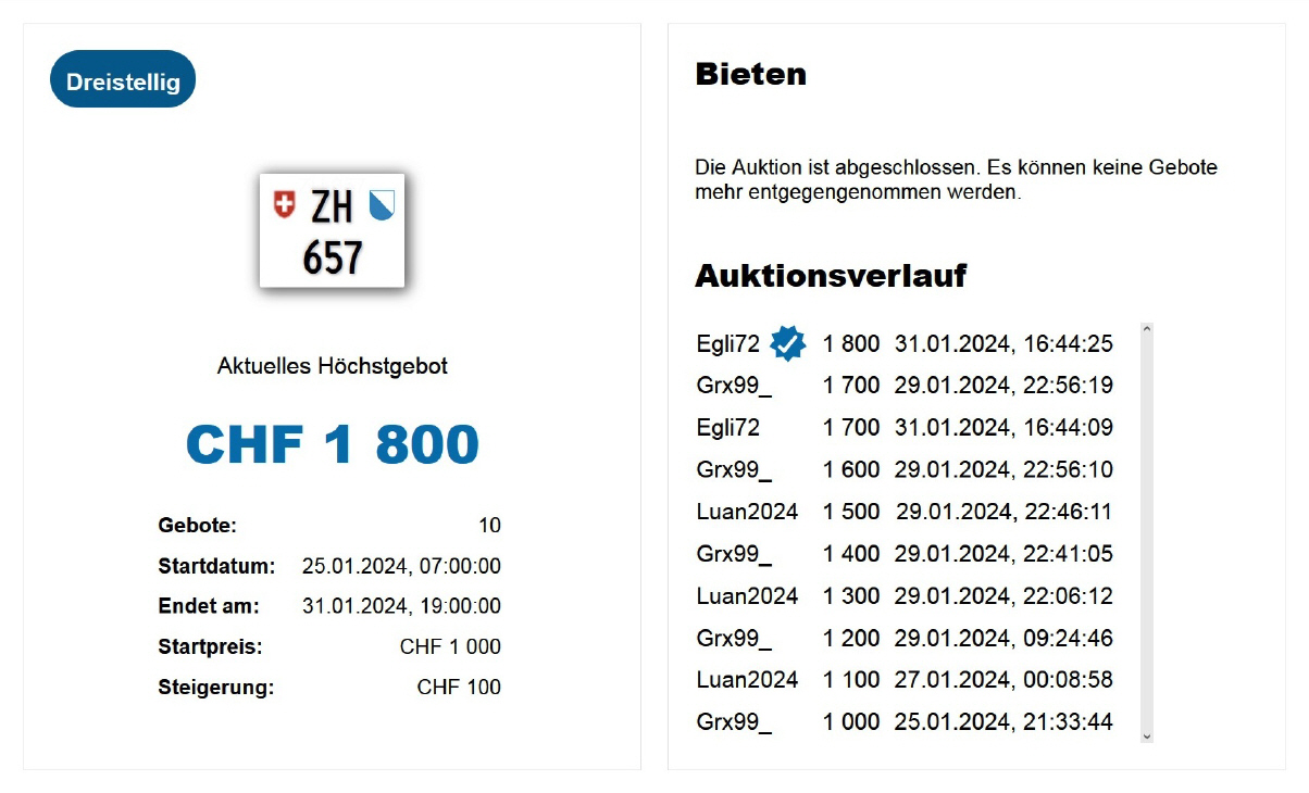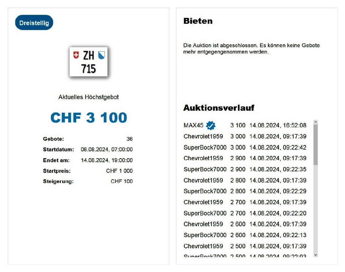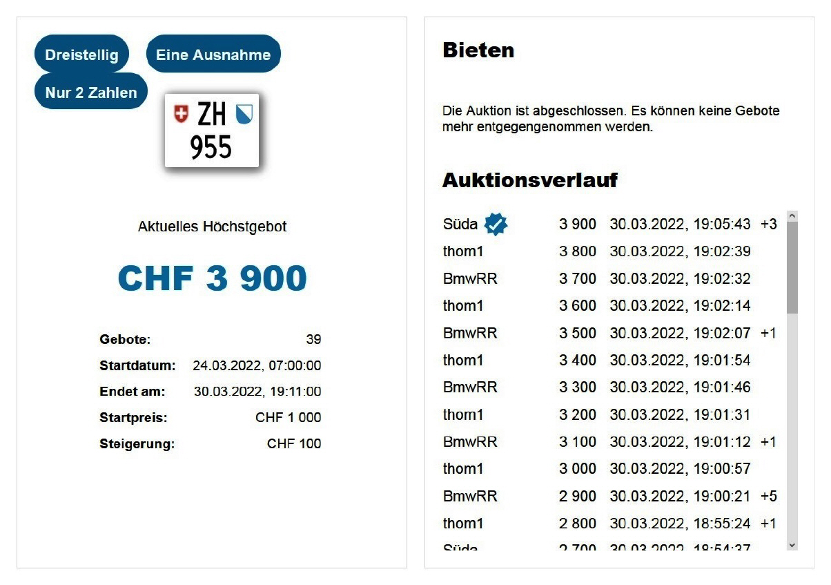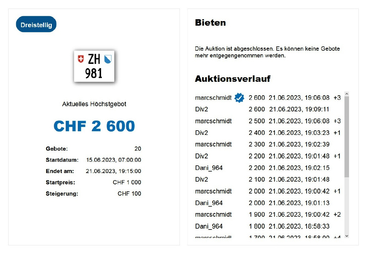 Am 25.11.2020 wurde im Kanton Zürich das 3-stellige TÖFF-Nummernschild ausgegeben - in der Auktion ging es für Fr. 4000.- weg: Auch hier boten sich zwei Bieter hoch! Verfolge den Verlauf vom «ZH 701