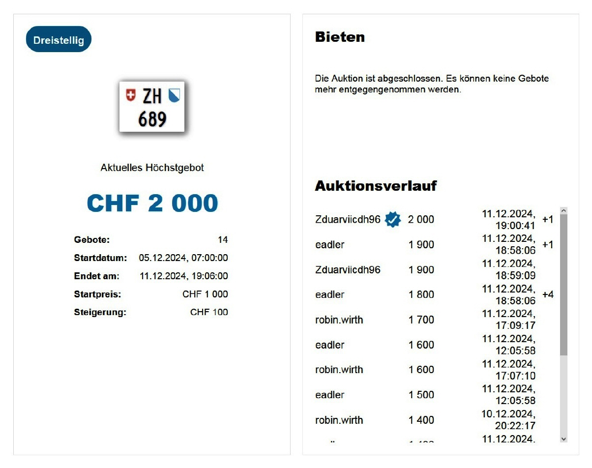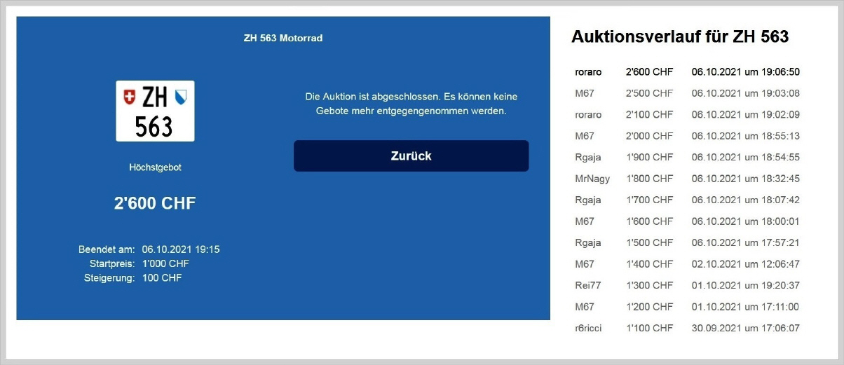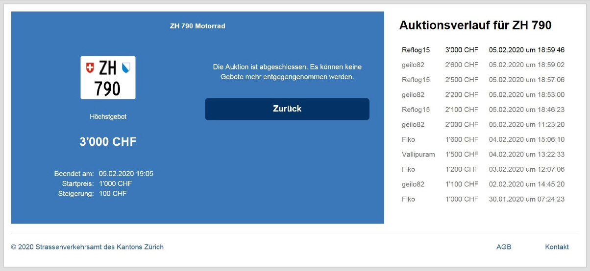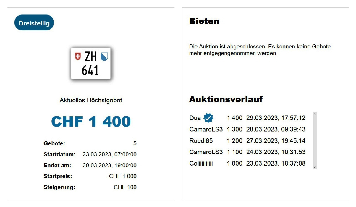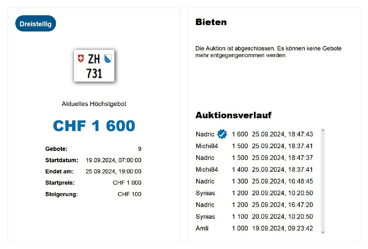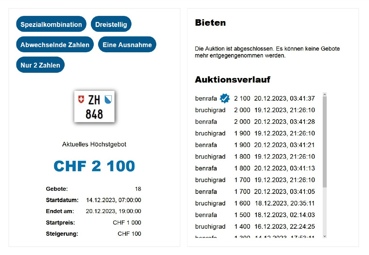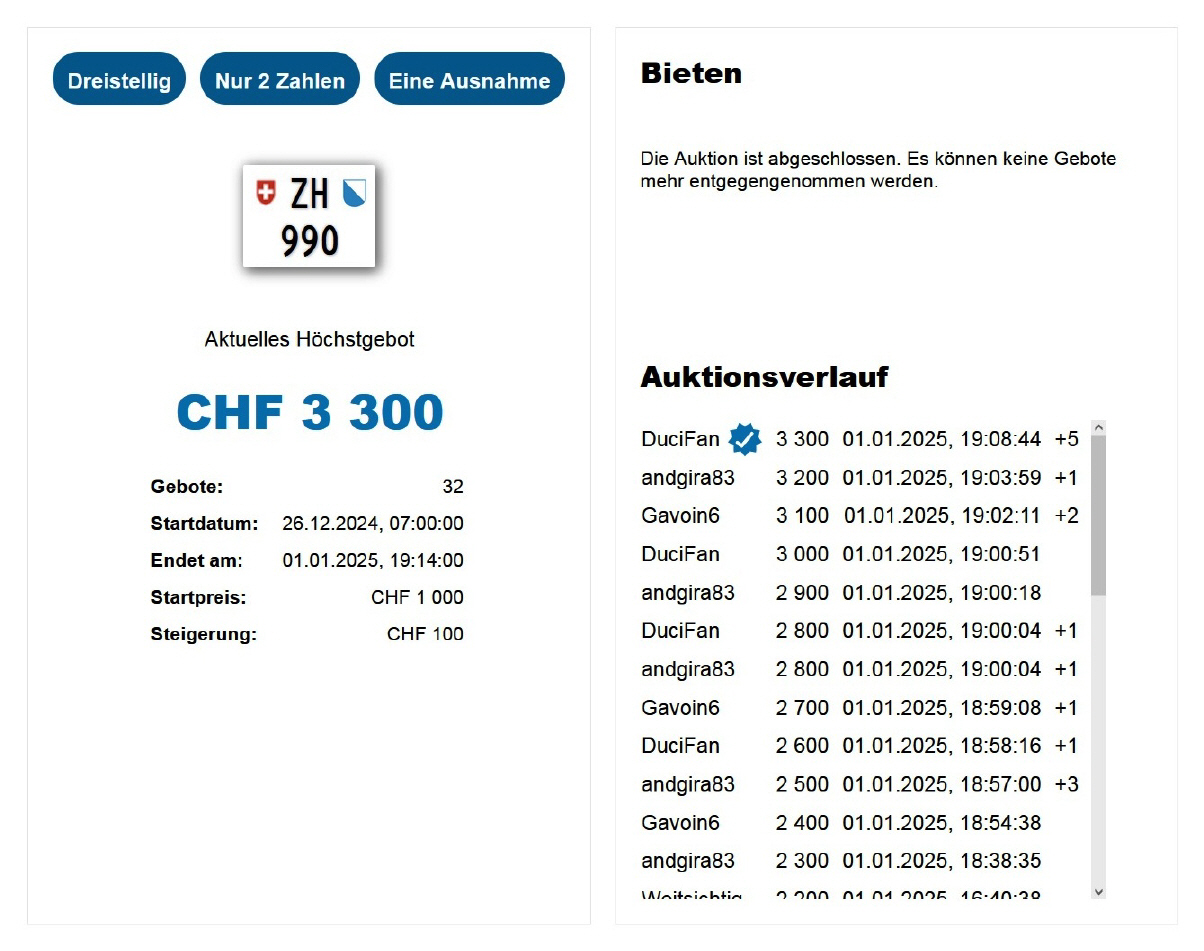 Am 25.11.2020 wurde im Kanton Zürich das 3-stellige TÖFF-Nummernschild ausgegeben - in der Auktion ging es für Fr. 4000.- weg: Auch hier boten sich zwei Bieter hoch! Verfolge den Verlauf vom «ZH 701