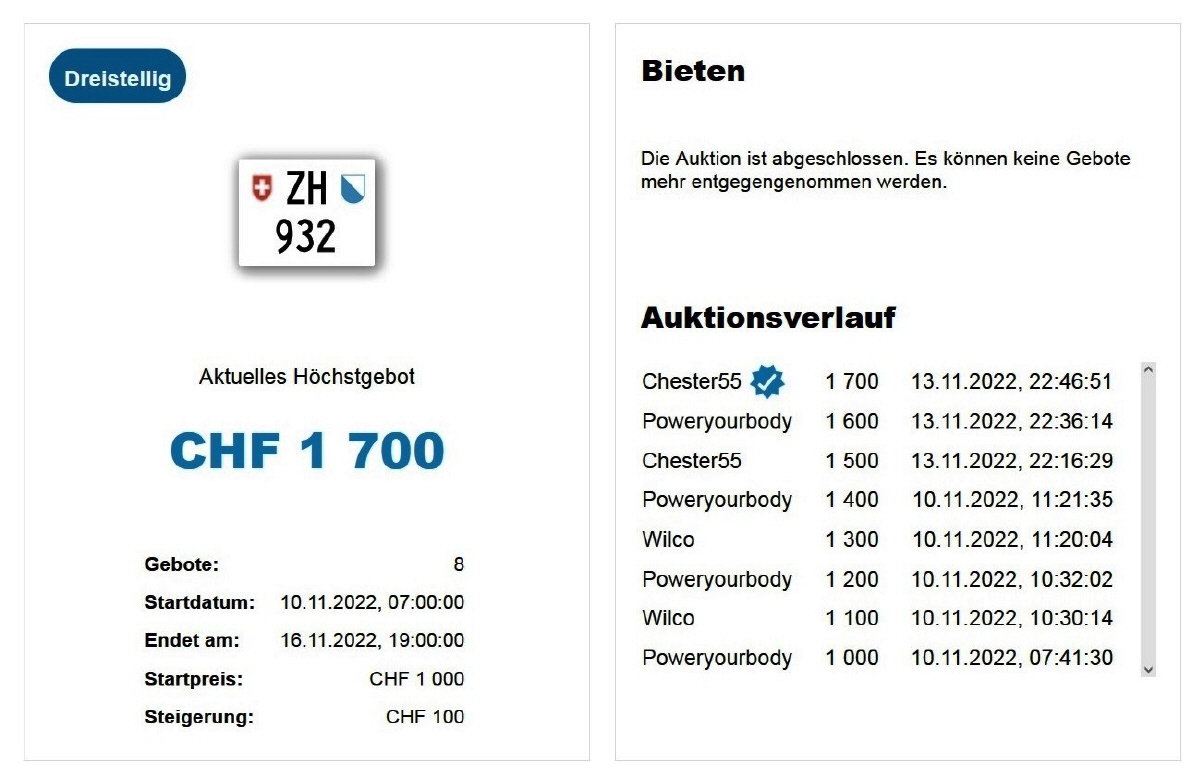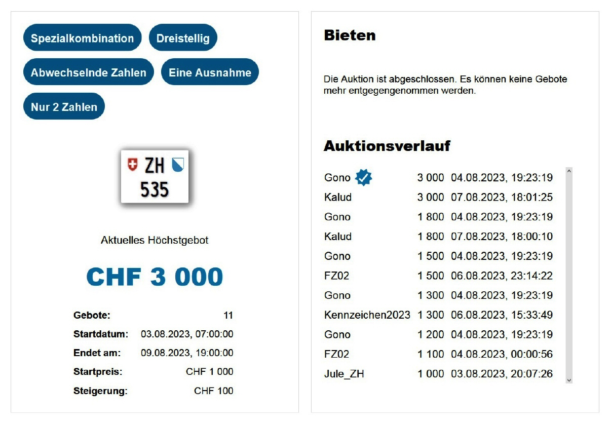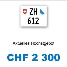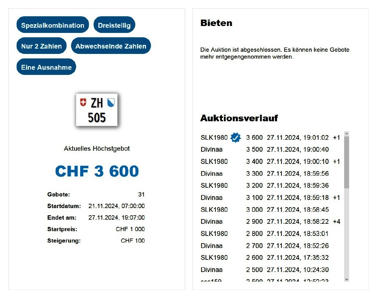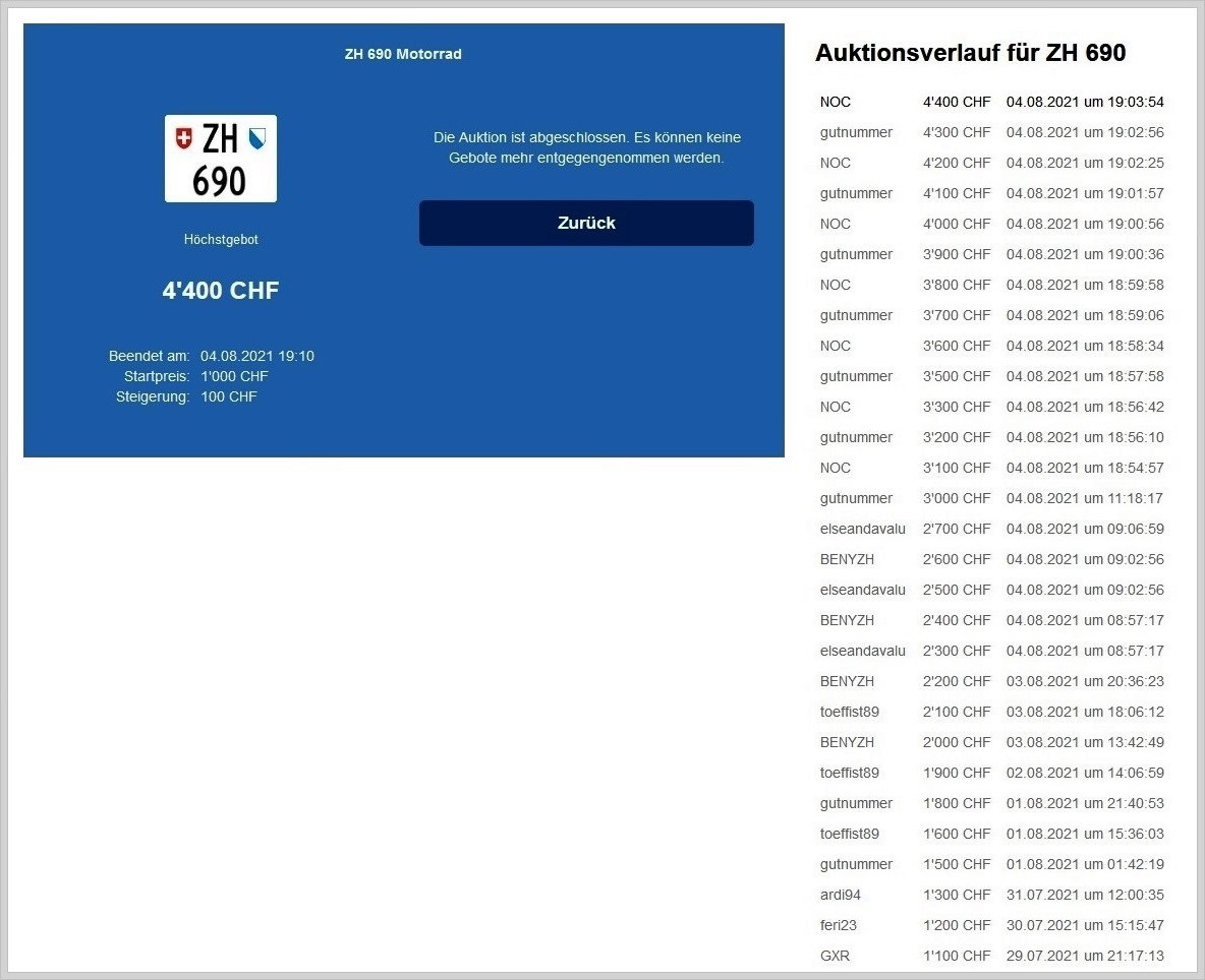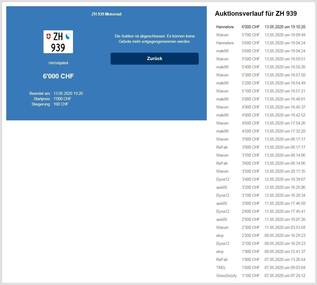 Am 25.11.2020 wurde im Kanton Zürich das 3-stellige TÖFF-Nummernschild ausgegeben - in der Auktion ging es für Fr. 4000.- weg: Auch hier boten sich zwei Bieter hoch! Verfolge den Verlauf vom «ZH 701