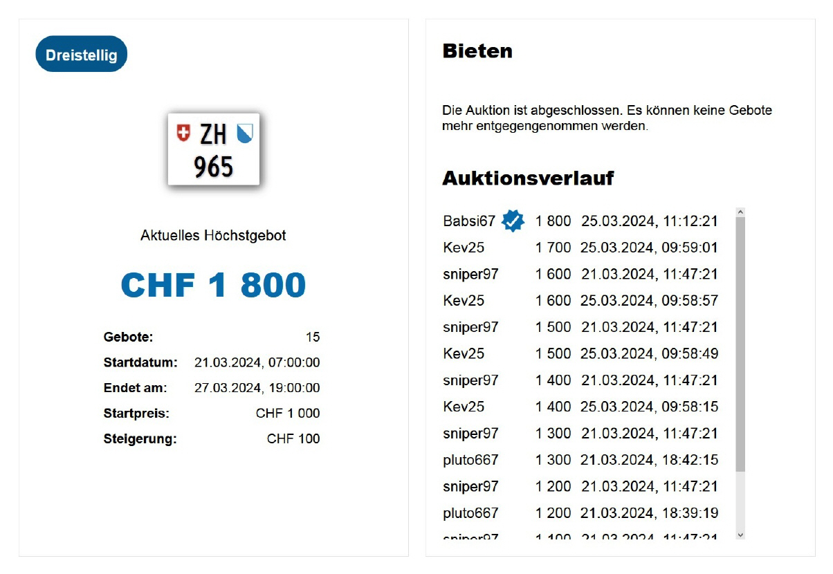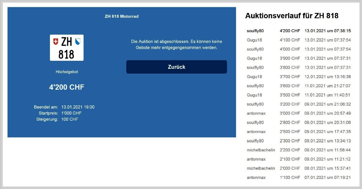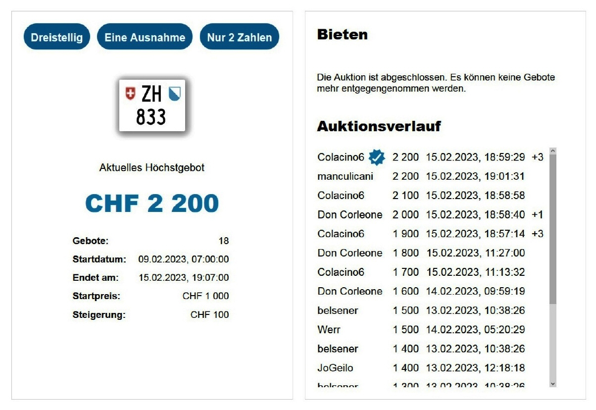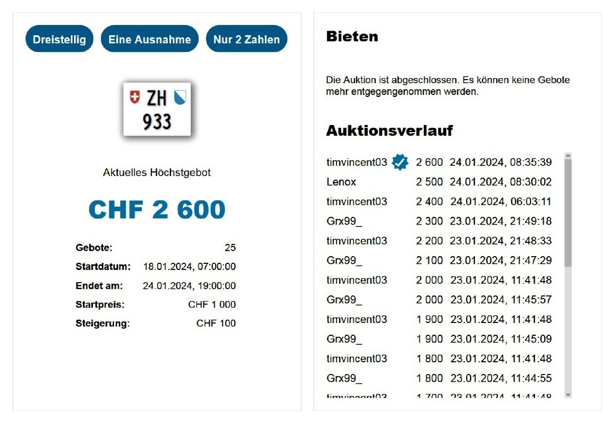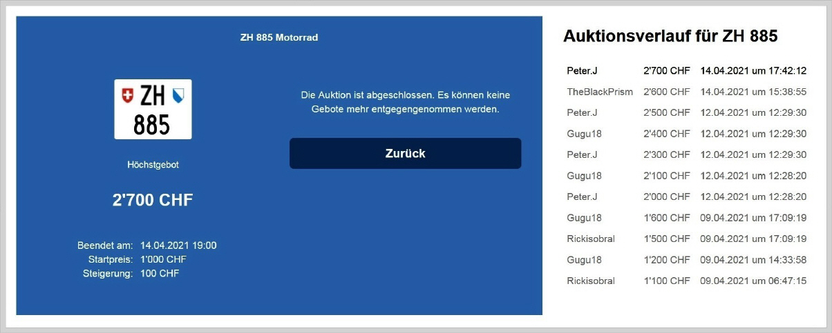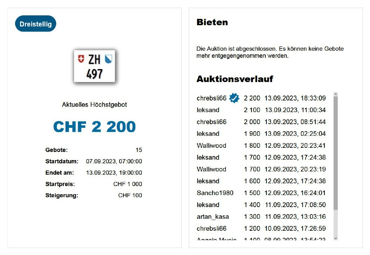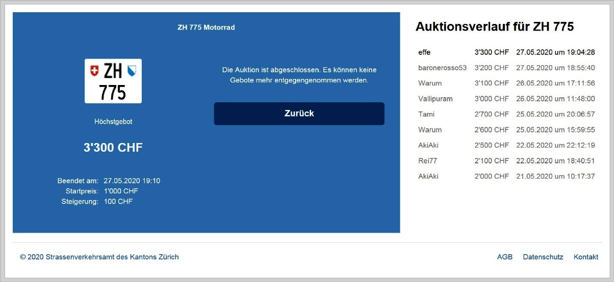Am 25.11.2020 wurde im Kanton Zürich das 3-stellige TÖFF-Nummernschild ausgegeben - in der Auktion ging es für Fr. 4000.- weg: Auch hier boten sich zwei Bieter hoch! Verfolge den Verlauf vom «ZH 701