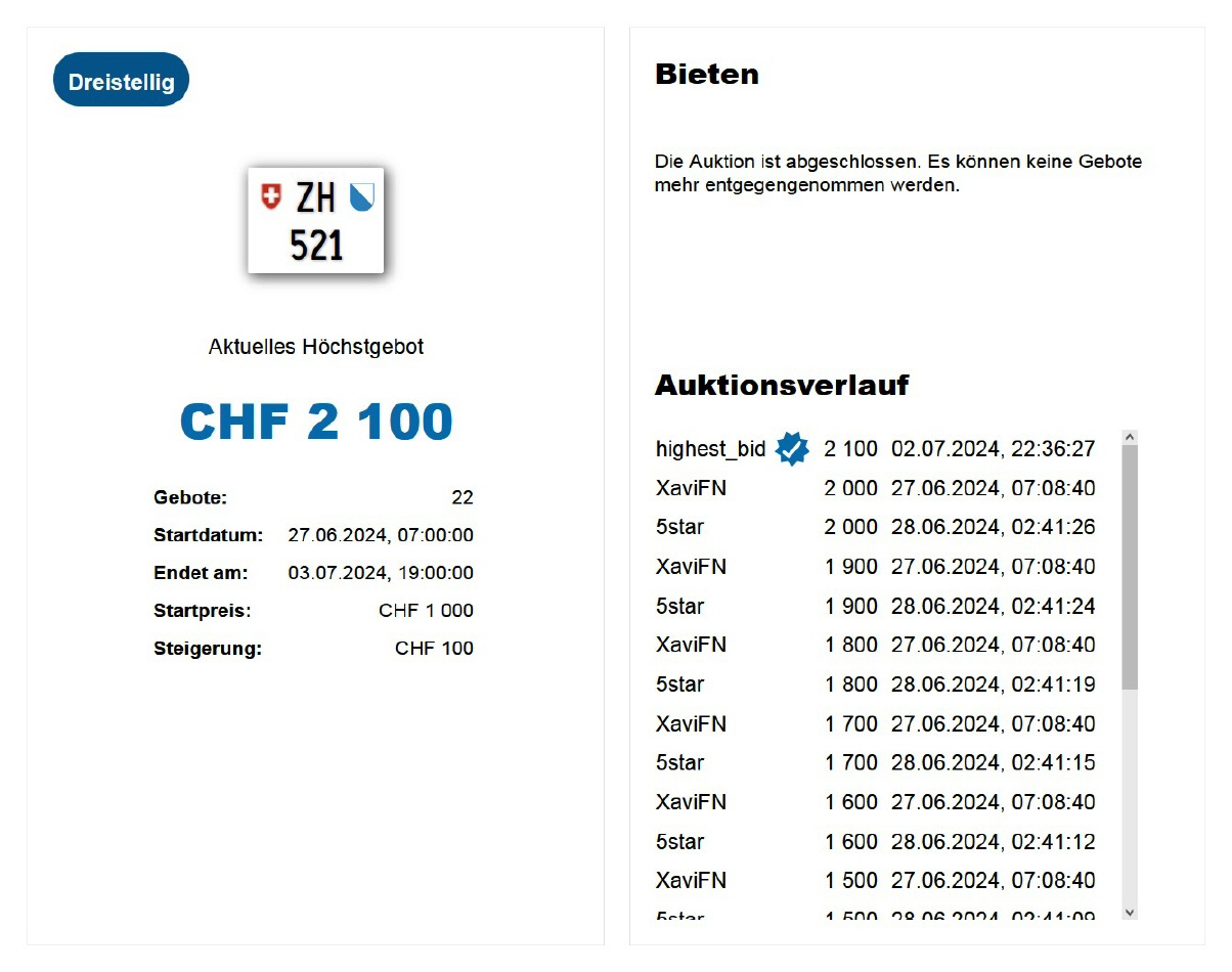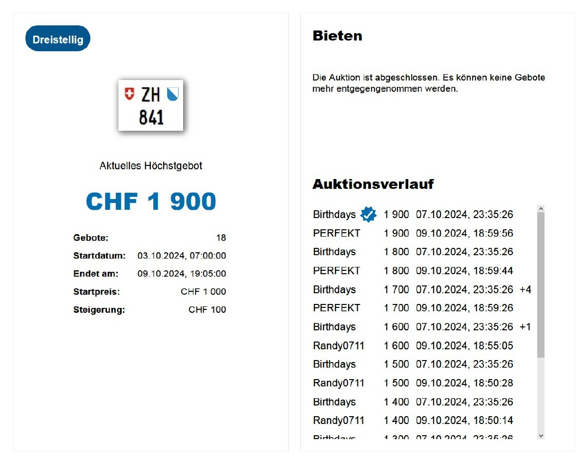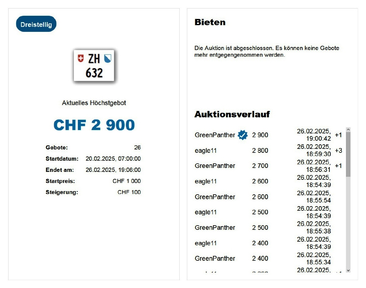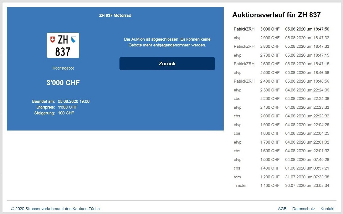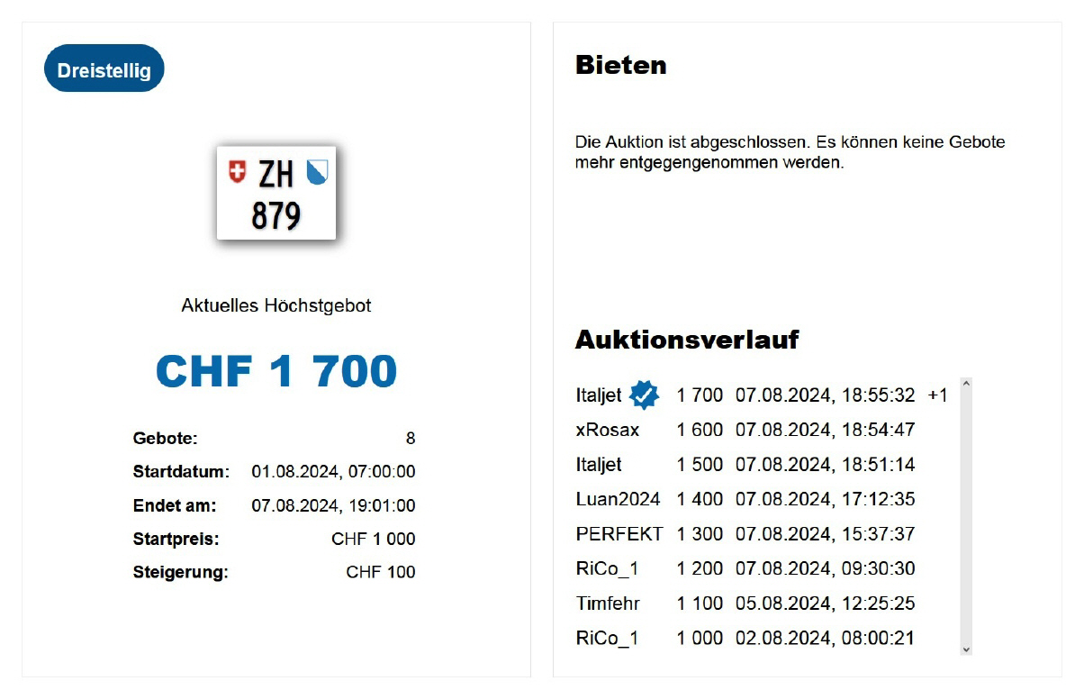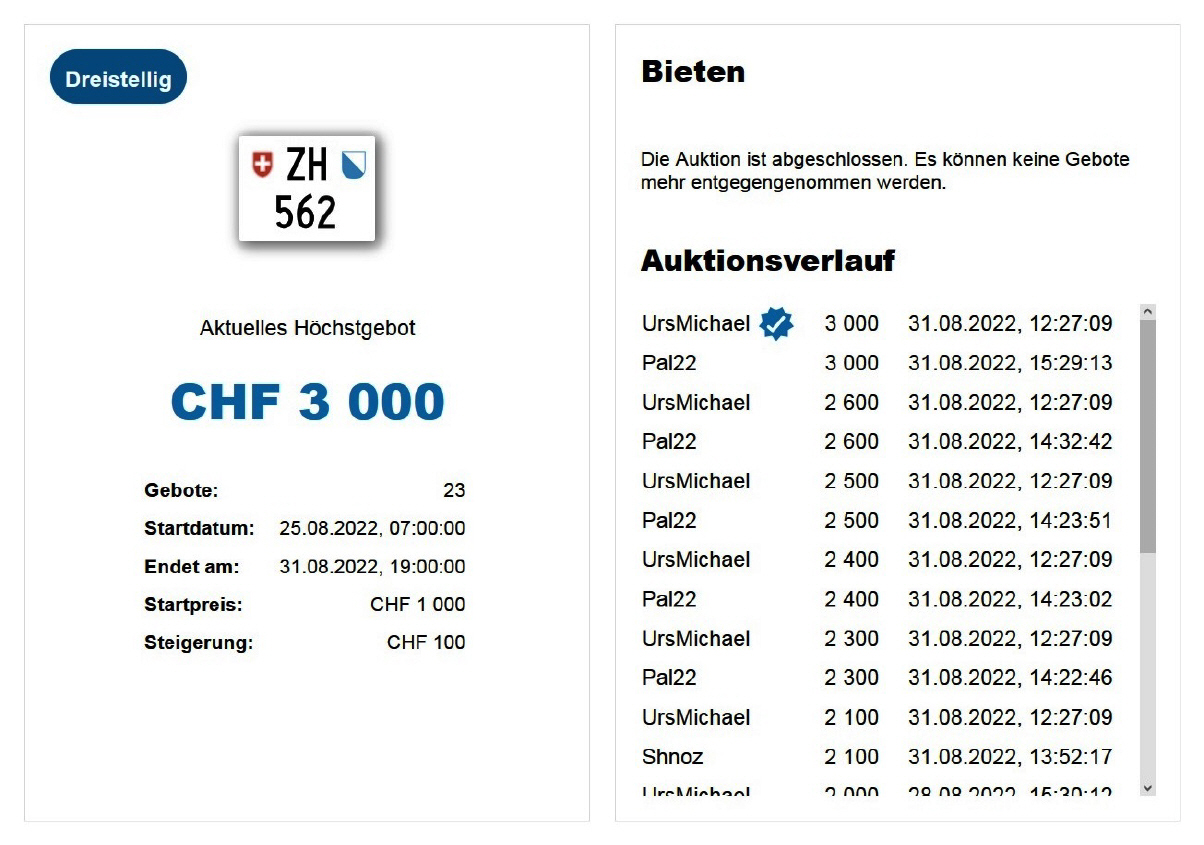 Am 25.11.2020 wurde im Kanton Zürich das 3-stellige TÖFF-Nummernschild ausgegeben - in der Auktion ging es für Fr. 4000.- weg: Auch hier boten sich zwei Bieter hoch! Verfolge den Verlauf vom «ZH 701