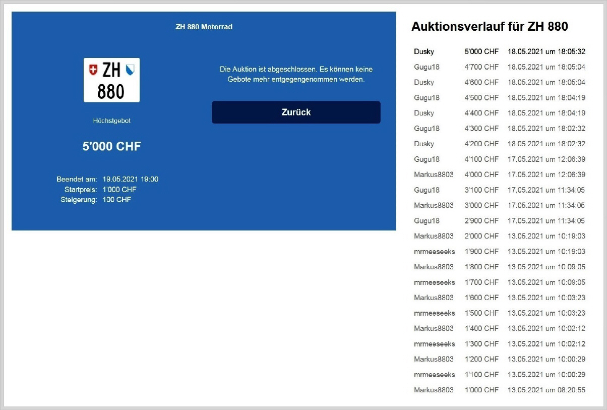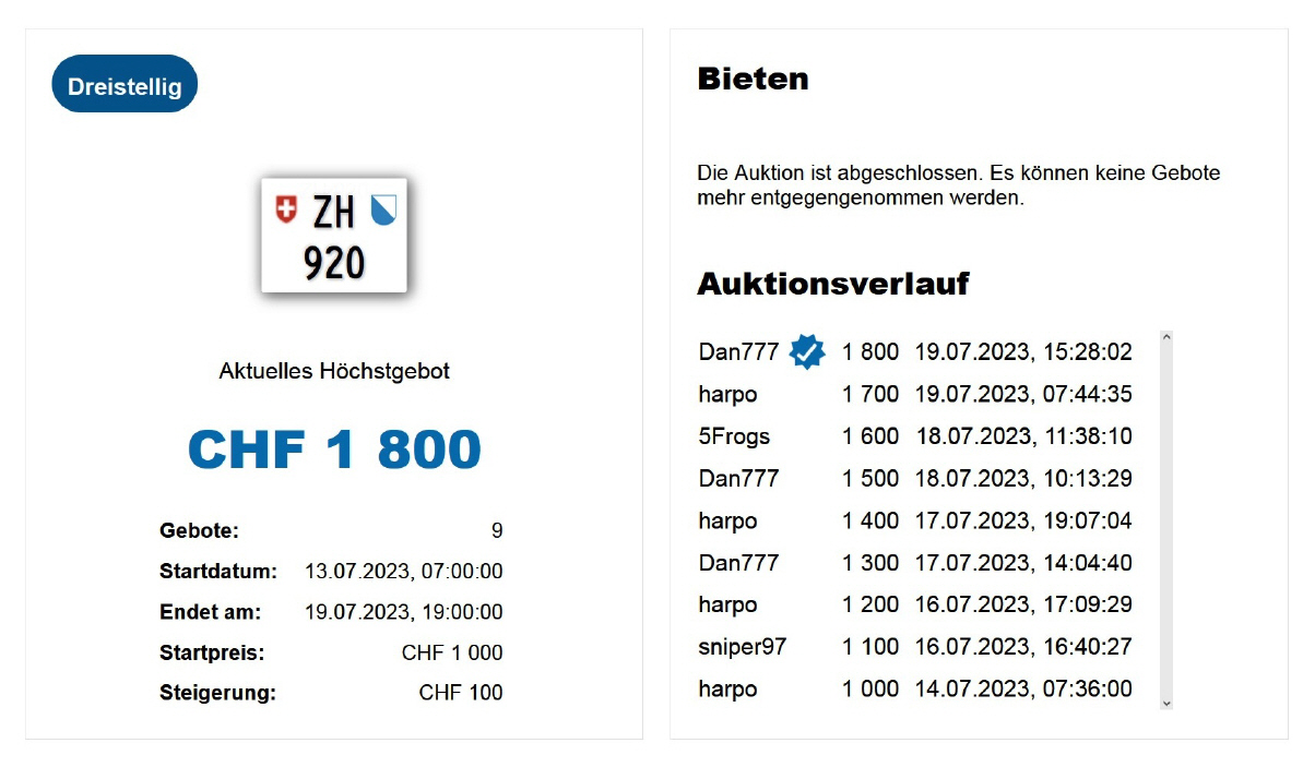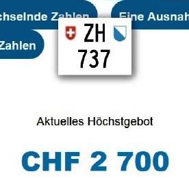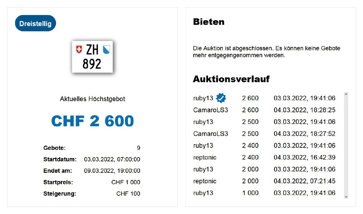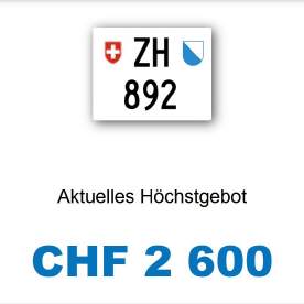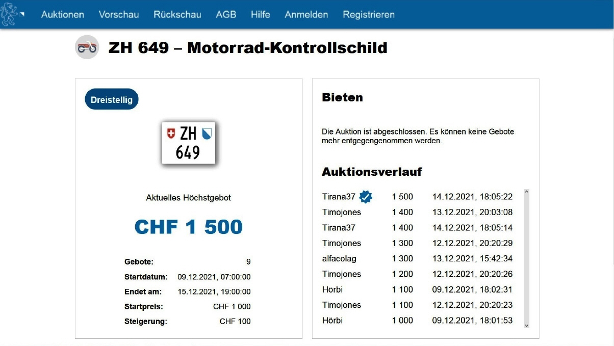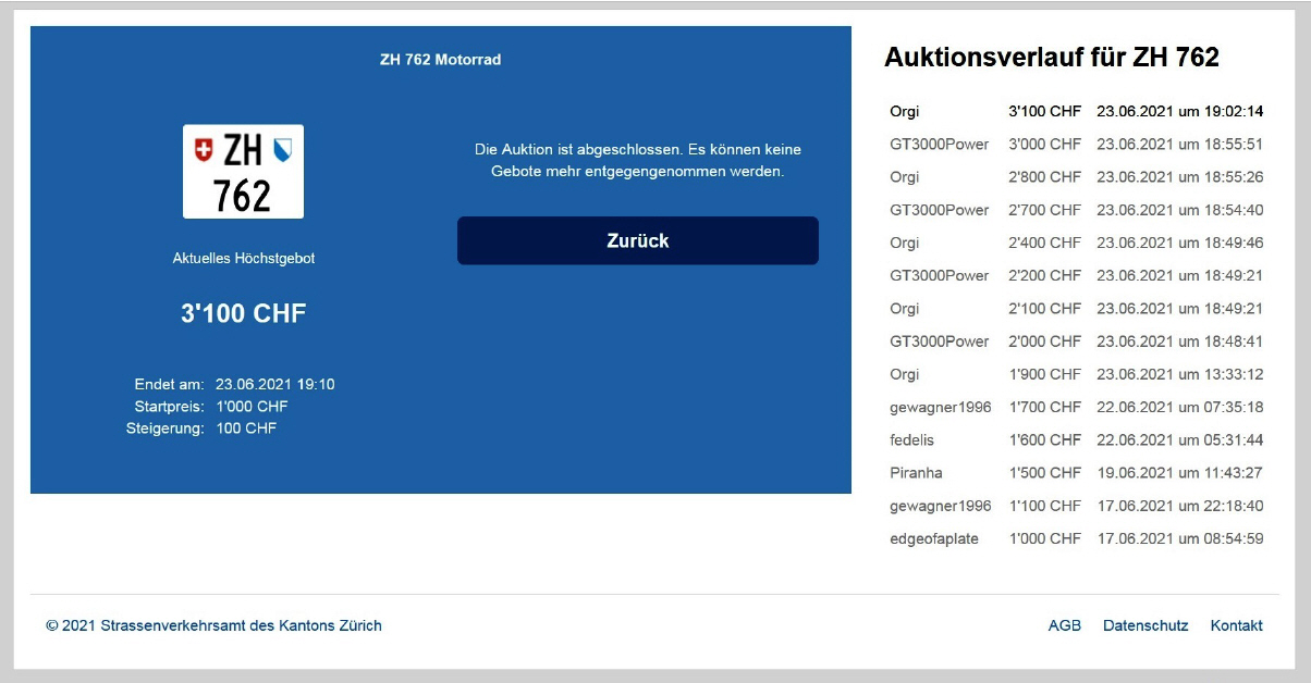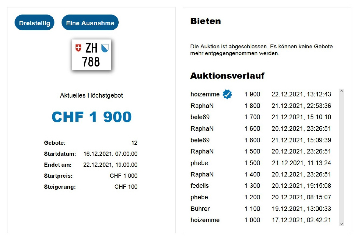 Am 25.11.2020 wurde im Kanton Zürich das 3-stellige TÖFF-Nummernschild ausgegeben - in der Auktion ging es für Fr. 4000.- weg: Auch hier boten sich zwei Bieter hoch! Verfolge den Verlauf vom «ZH 701