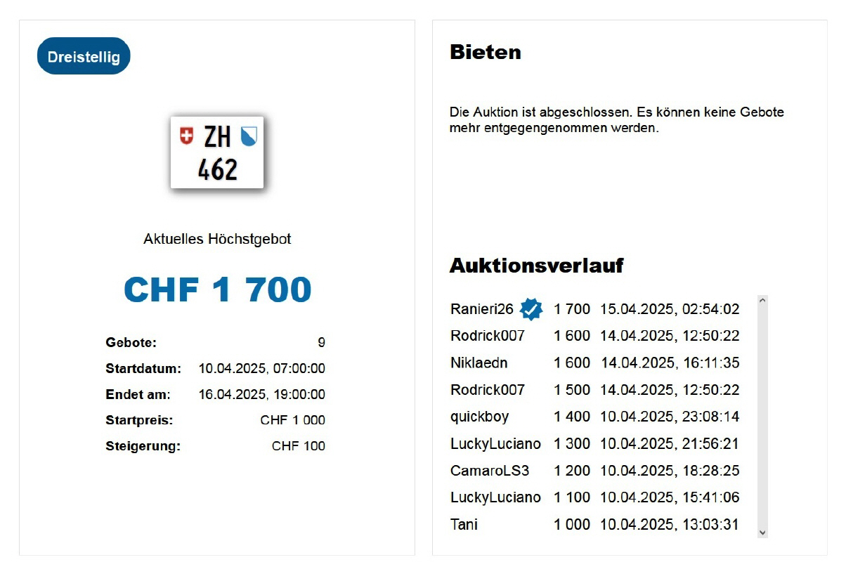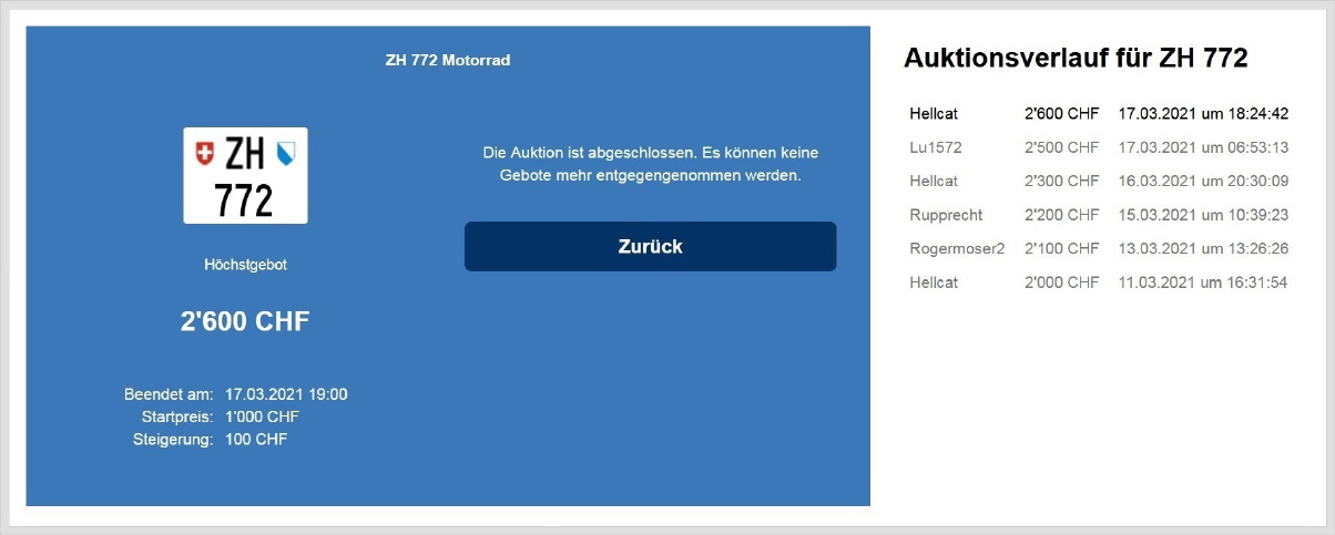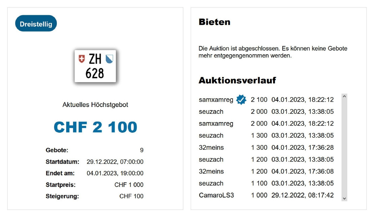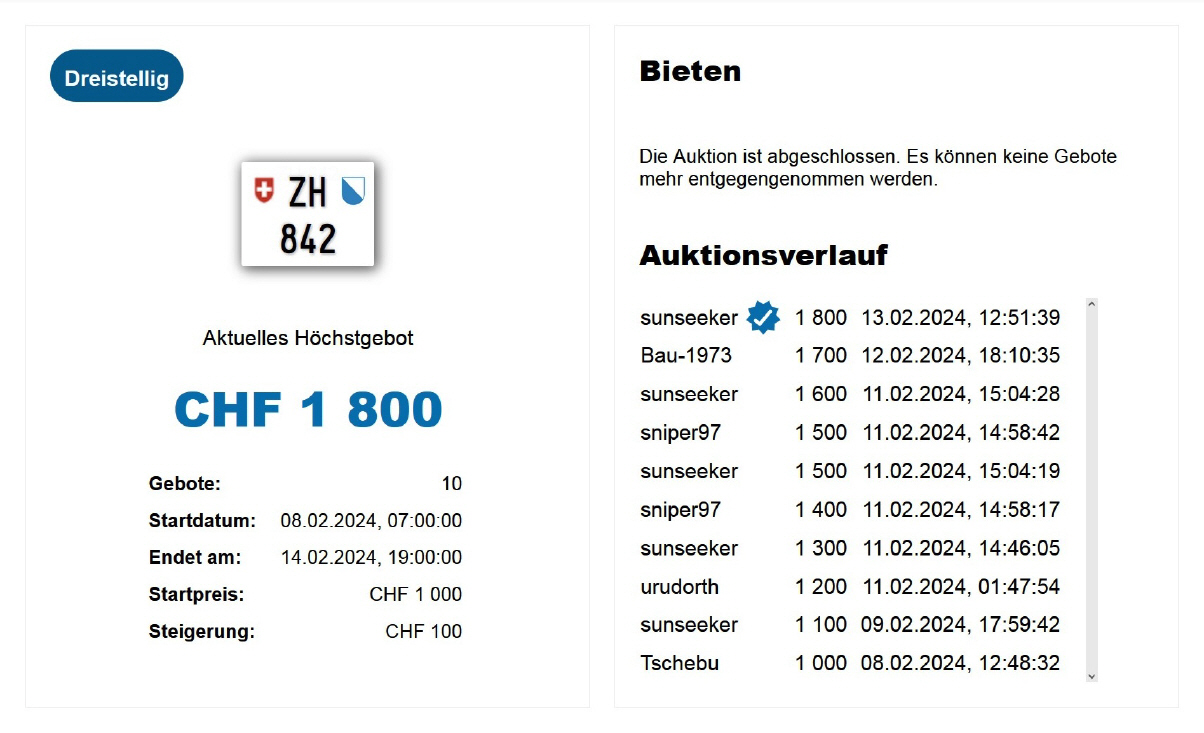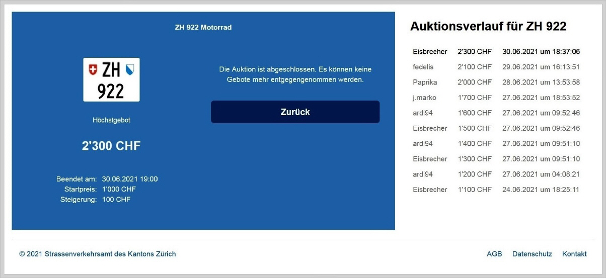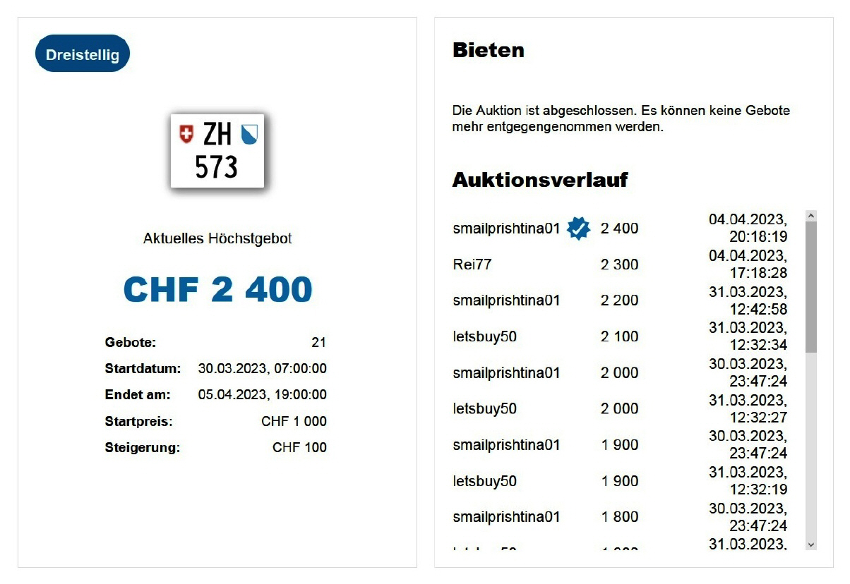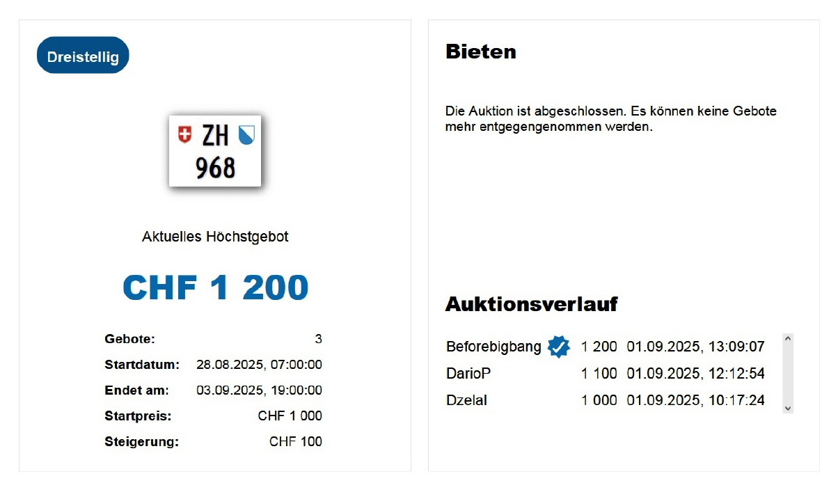 Am 25.11.2020 wurde im Kanton Zürich das 3-stellige TÖFF-Nummernschild ausgegeben - in der Auktion ging es für Fr. 4000.- weg: Auch hier boten sich zwei Bieter hoch! Verfolge den Verlauf vom «ZH 701